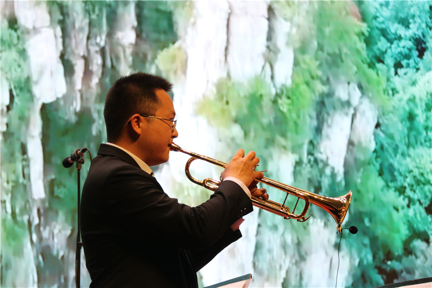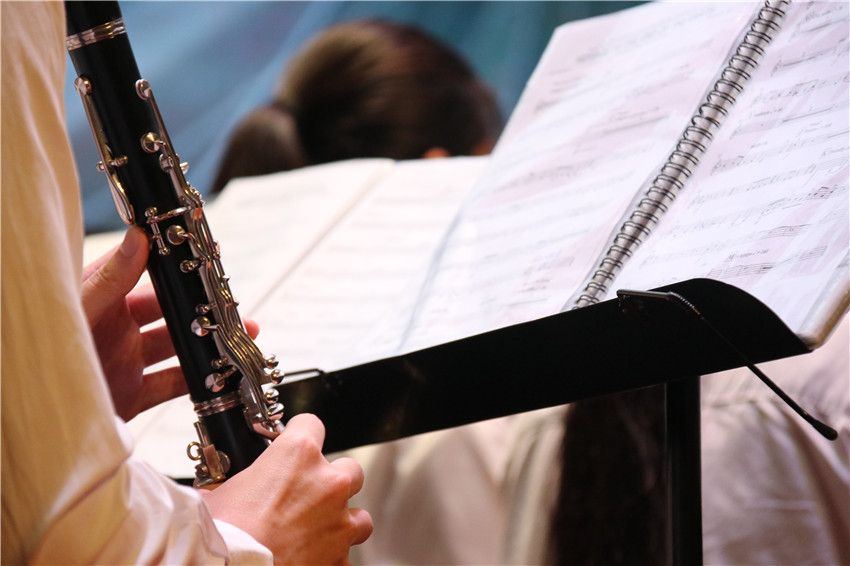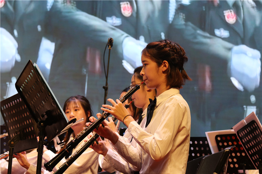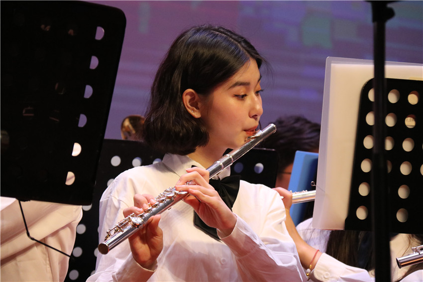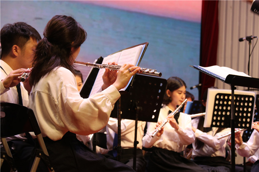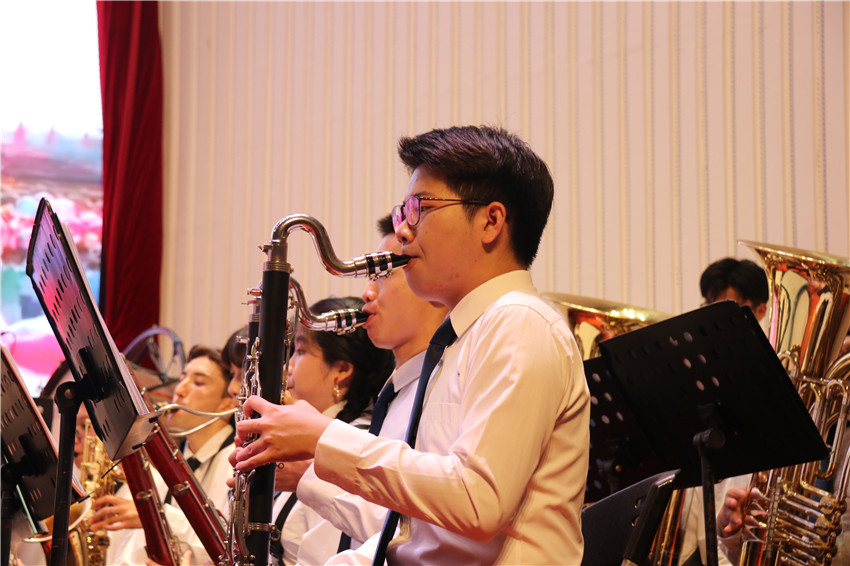 百年艰苦卓绝,托起了共和国的梦想与希望;百年栉风沐雨,谱写了共和国的发展与辉煌。一路坎坷,一路奋斗,一路华章,伟大的中国共产党迎来了百年华诞;党旗照亮青春的道路,彩霞点燃心中的火焰,校园放飞欢唱的歌声,心底漾起喜悦的漩涡。音乐会以交响乐《红旗颂》开场,经典的旋律再一次向观众展现了壮阔的历史场景和磅礴的革命气势。随后,管乐团为给大家带来了耳熟能详的《追寻》《山丹丹开花红艳艳》《太阳出来喜洋洋》《爱我中华》《阳光之路》《航行到世界的尽头》等经典曲目,师生们的精湛演奏与音乐的深厚内涵交相辉映,使观众沉浸在音乐的海洋。
