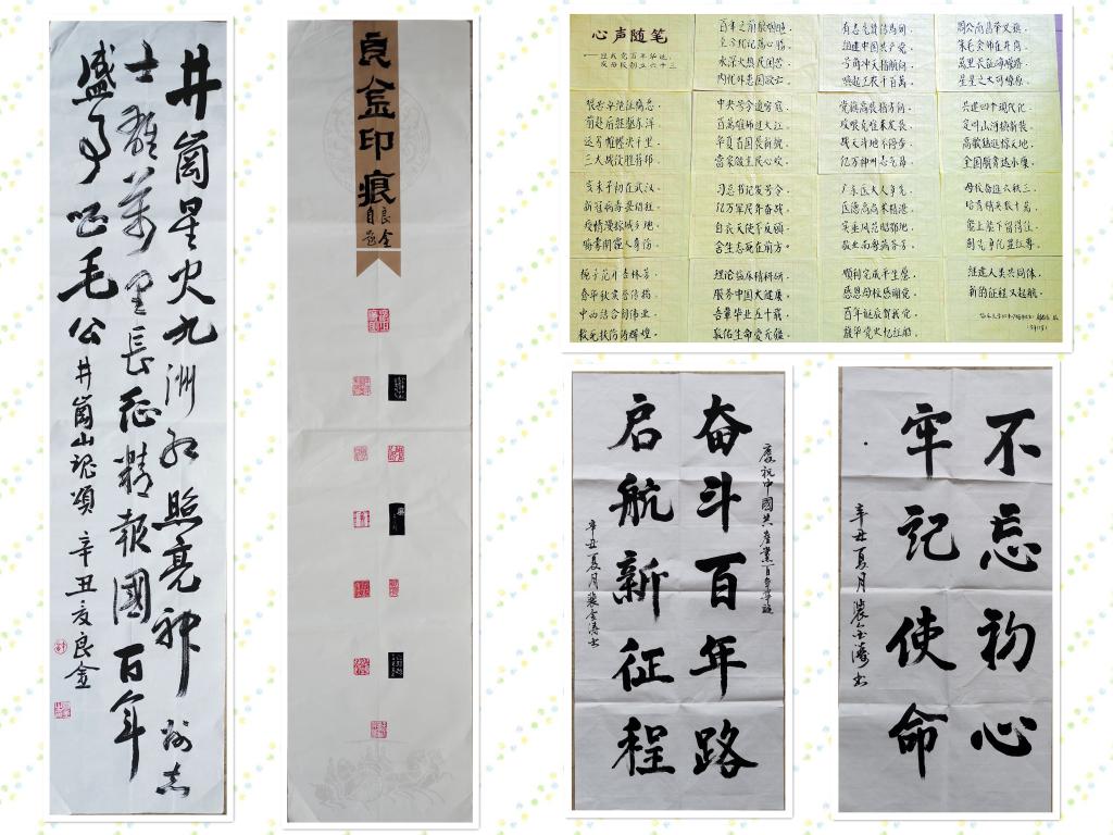 有的通过书法作品回顾了中国共产党建党百年历史中的光辉事件以及为国为民的宗旨,更令人感动的是ac米兰70届毕业生、今年73岁的校友郑忠东亲自书写了自己的原创作品,向党的百年华诞及母校校庆献礼。