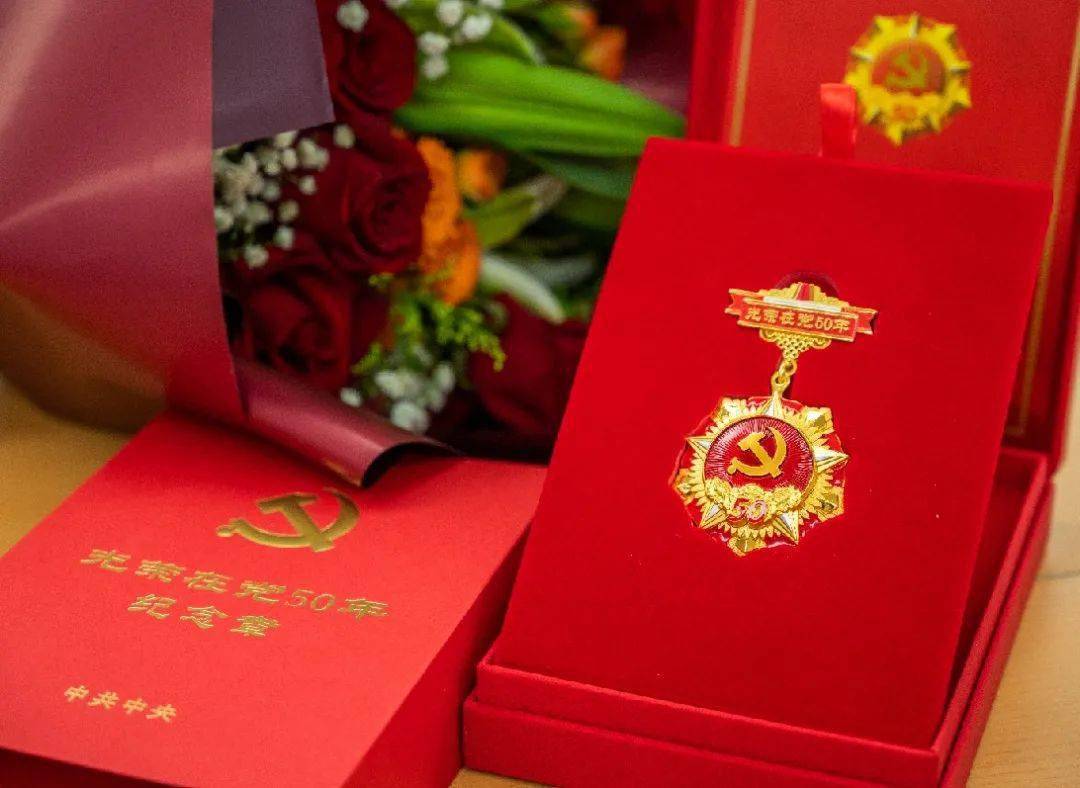 “光荣在党50年”纪念章通径为50毫米,材质为铜锌合金,主色调为红色和金色。主章由党徽、五角星、旗帜、丰碑、向日葵、光荣花、光芒等元素构成,副章由山河、中国结和红飘带等元素组成,飘带上雕有“光荣在党50年”字样,寓意党员不忘初心、牢记使命,勇攀高峰、永葆青春。