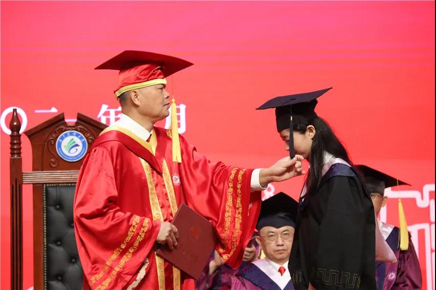 在测量体温、查验健康码、佩戴口罩、控制规模等系列措施后,卢景辉书记校长为在场毕业生逐一拨穗。
