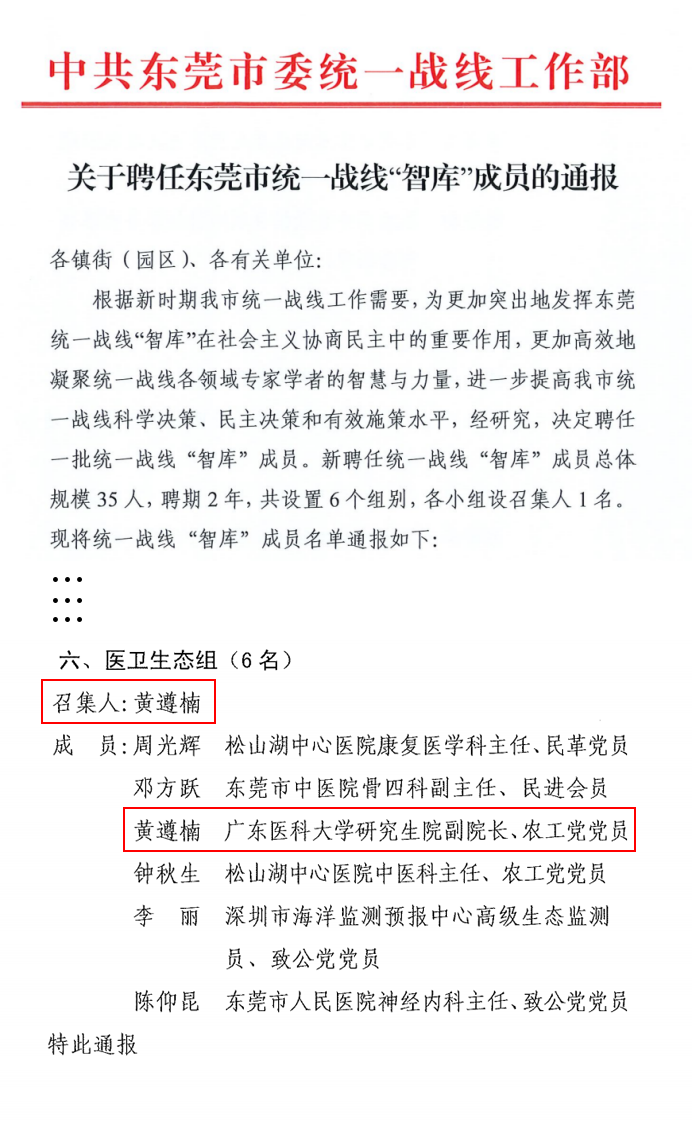 本次新聘任的东莞市统一战线“智库”成员共有35人,共设置了经济金融组、农村农业组、社会法治组、科技教育组、文化文艺组、医卫生态组6个组别,ac米兰官网中文网站研究生院副院长黄遵楠教授入选名单,并担任医卫生态组召集人,围绕医药卫生、科技优势领域,为“湾区都市、品质东莞”的建设积极建言献策。