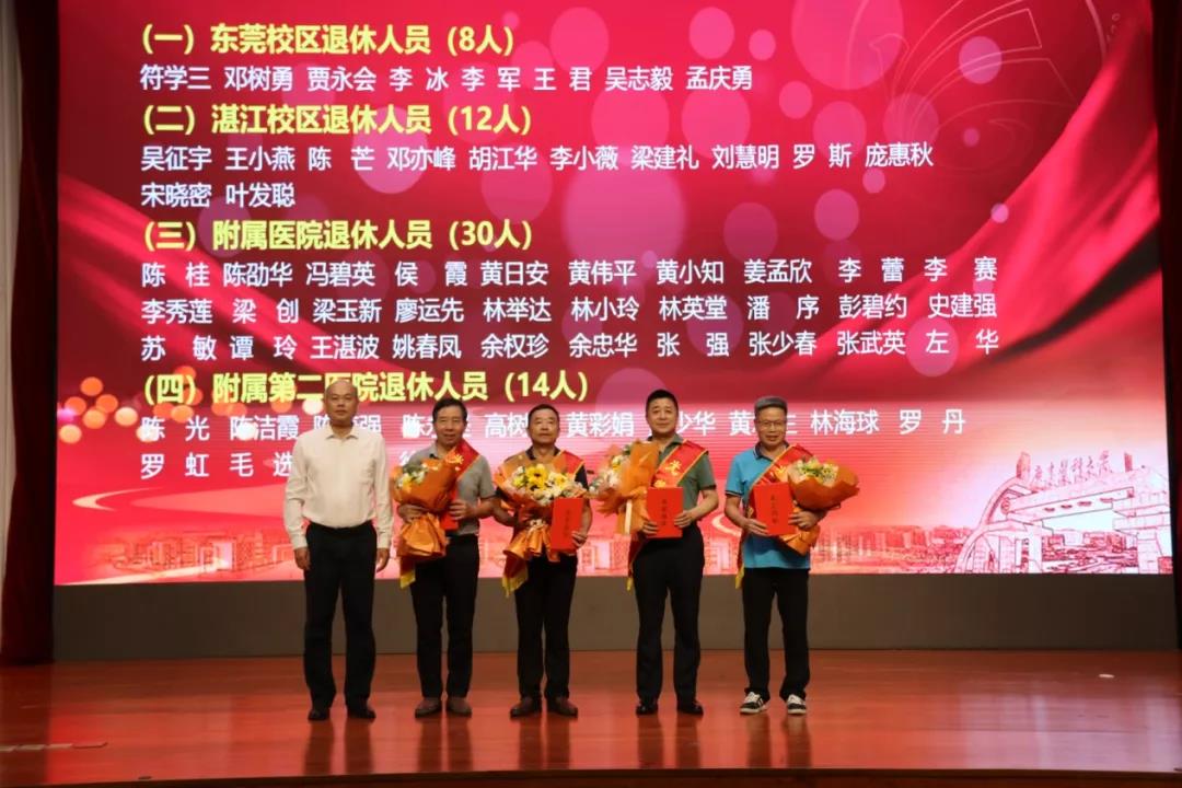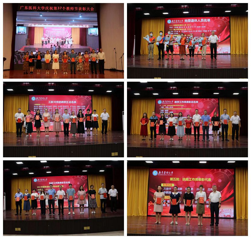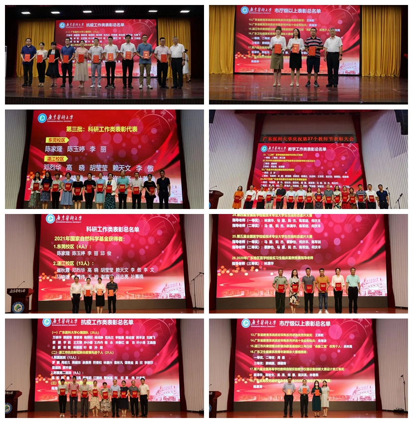 大会表彰了工龄30周年的教职工、获得国家、省级一流课程、一流专业、省级一流课程思政的团队和先进个人、2021年“南粤优秀教师”、“广东省教学名师”,表彰了在疫情防控方面、教育教学方面、科学研究方面、指导学生比赛方面等荣获国家、省级表彰的教职工。在退休教师荣休仪式上,校领导为荣休教师代表颁发荣誉证书和鲜花,致以崇高敬意。