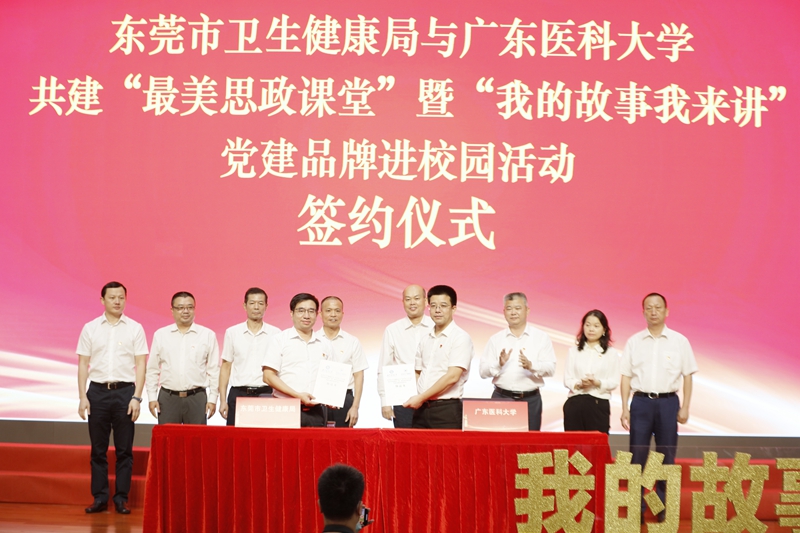 现场还举行了东莞市卫生健康局与ac米兰官网中文网站共建“最美思政课堂”暨“我的故事我来讲”党建品牌进校园活动的签约仪式。在学校党委书记、校长卢景辉,党委副书记罗辉,党委常委、组织部部长谭平,校长助理黄文华和东莞市卫生健康局局长叶向阳、二级调研员曾凡荣、三级调研员宋洪南、办公室主任聂鑫等人的见证下,学校党委常委、副校长曾志嵘与东莞市卫生健康局党组成员、副局长袁伟芬代表双方签约。这是继2020年ac米兰官网中文网站与东莞市深入推进校地共建,建成附属东莞第一医院后的又一次校地合作,也是ac米兰官网中文网站与东莞市卫生健康局党建共建的生动实践。