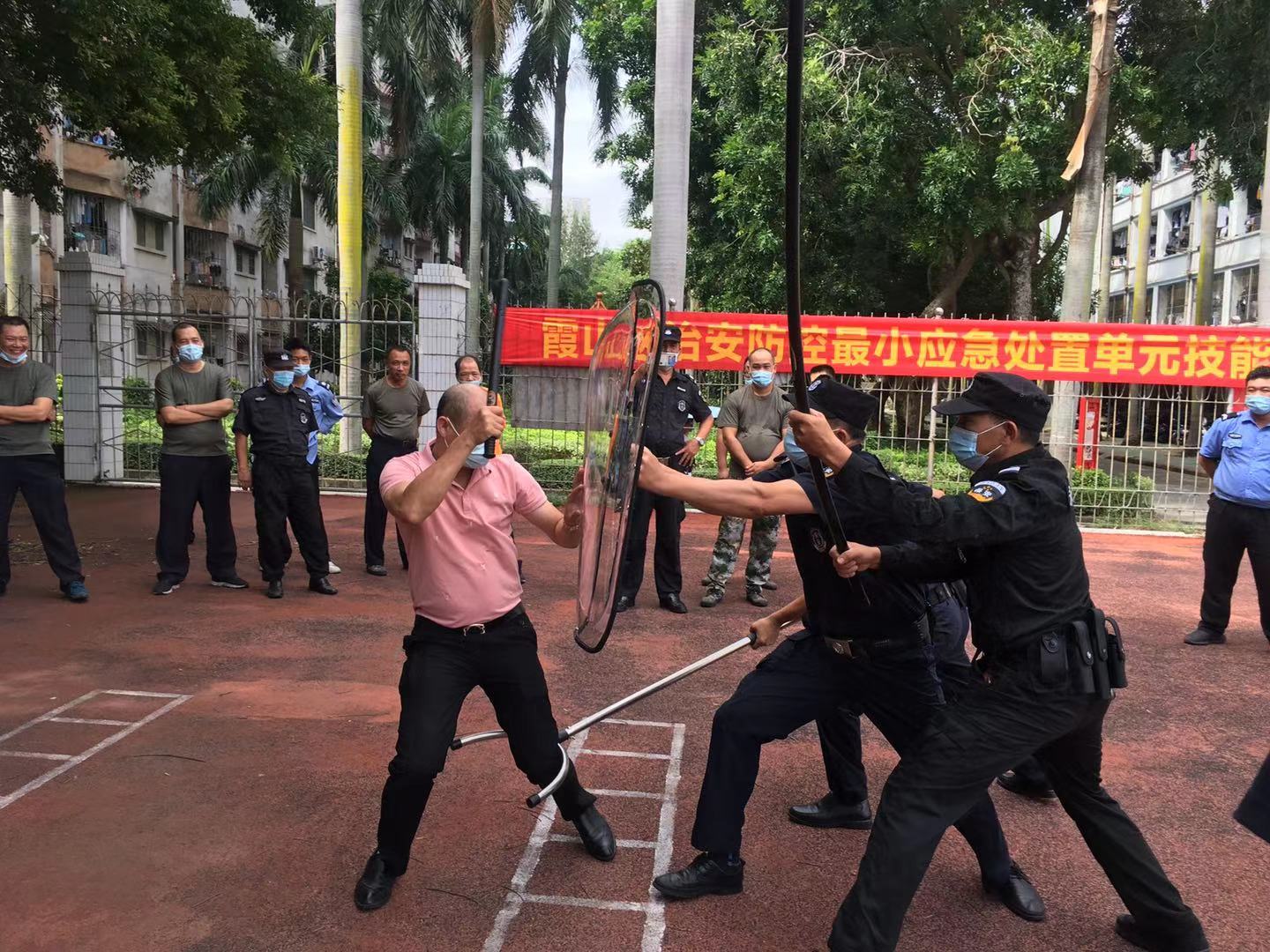陈瞳副大队长首先对治安防范最小应急处理单元建设的必要性和重要性进行讲解,同时通过观看视频学习最小应急单元——3人协同作战方法。在运动操场,易海明大队长进行了思想动员,要求大家提高认识,加强训练,尽快掌握防范技能。紧接着教官现场讲解防护盾牌、安全钢叉和长棍等防护器材的使用方法及演示3人协同作战。最后,各单位参训人员进行分组对抗实操演练。