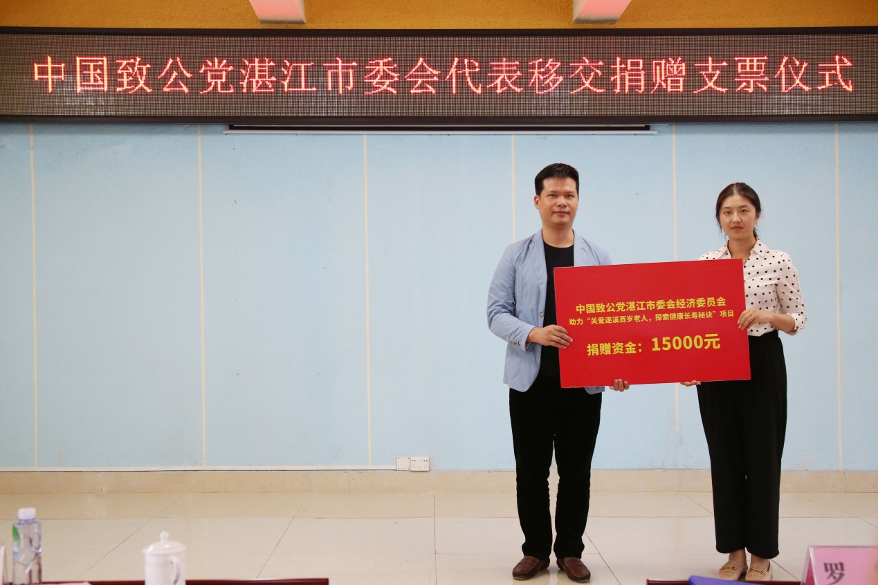 会议期间,现场还举办了遂溪县县域百岁老人健康促进项目启动暨百岁老人爱心服务站授牌仪式。授牌仪式上,罗辉、骆华庆分别为遂溪县15间卫生院授予“遂溪县百岁老人爱心服务站”牌匾。中国致公党湛江市委会经济专委会、广东润源中天有限公司分别为项目捐赠了支票和物资。