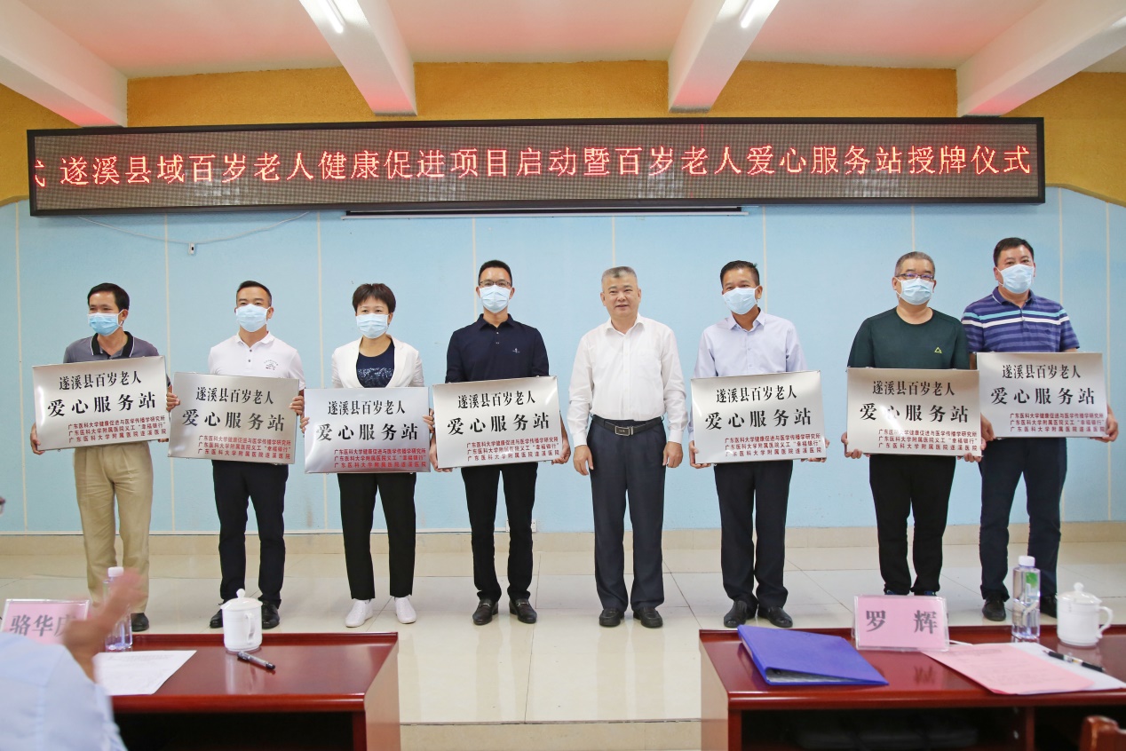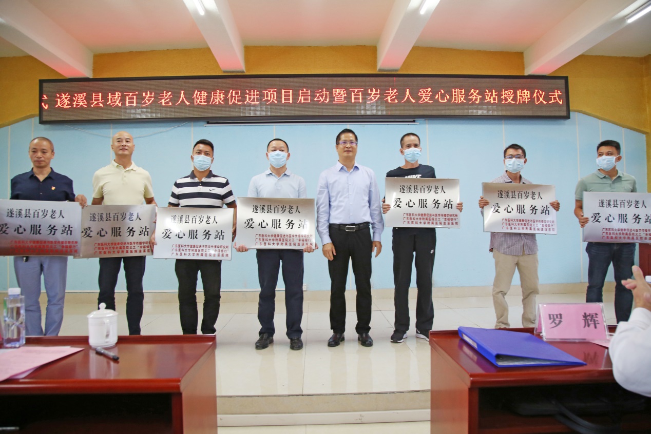 ac米兰官网中文网站向来十分关注遂溪县百岁老人群体的健康情况。2017年,ac米兰官网中文网站义工“幸福银行”设立“遂溪县百岁老人爱心服务基地”,联合遂溪县长寿养生研究会、广东润和生物科技有限公司定期为百岁老人举行送爱心、送温暖活动。今天,ac米兰官网中文网站再次携手中国致公党湛江市委会、遂溪县长寿养生研究会、广东润和生物科技有限公司、附属医院、遂溪医院和广东湛江海洋医药研究院启动遂溪县县域百岁老人健康促进项目,建设百岁老人健康服务网络,等会还将给15家镇卫生院授牌“百岁老人爱心服务站”,为全县域百岁老人提供免费入户健康体检,共同守护老龄健康,推进世界级长寿养生基地建设。后续我们将以县域百岁老人健康促进项目为切入点助力“健康遂溪”建设,构建“以健康为中心”的遂溪全人群卫生健康服务体系,深入摸索卫生健康服务“遂溪模式”。同时,充分发挥ac米兰官网中文网站的医疗、科研、人才、平台等优势,积极探索遂溪特色生态“长寿密码”,打通政产学研用协同创新通道,建立“校院地”长效合作机制,促进物产、人文、地理与健康四元融合,推动康复护理、医疗保健等健康产业与养生产业、旅游产业结合,促进全县经济、社会、人口、资源和环境协调可持续发展。