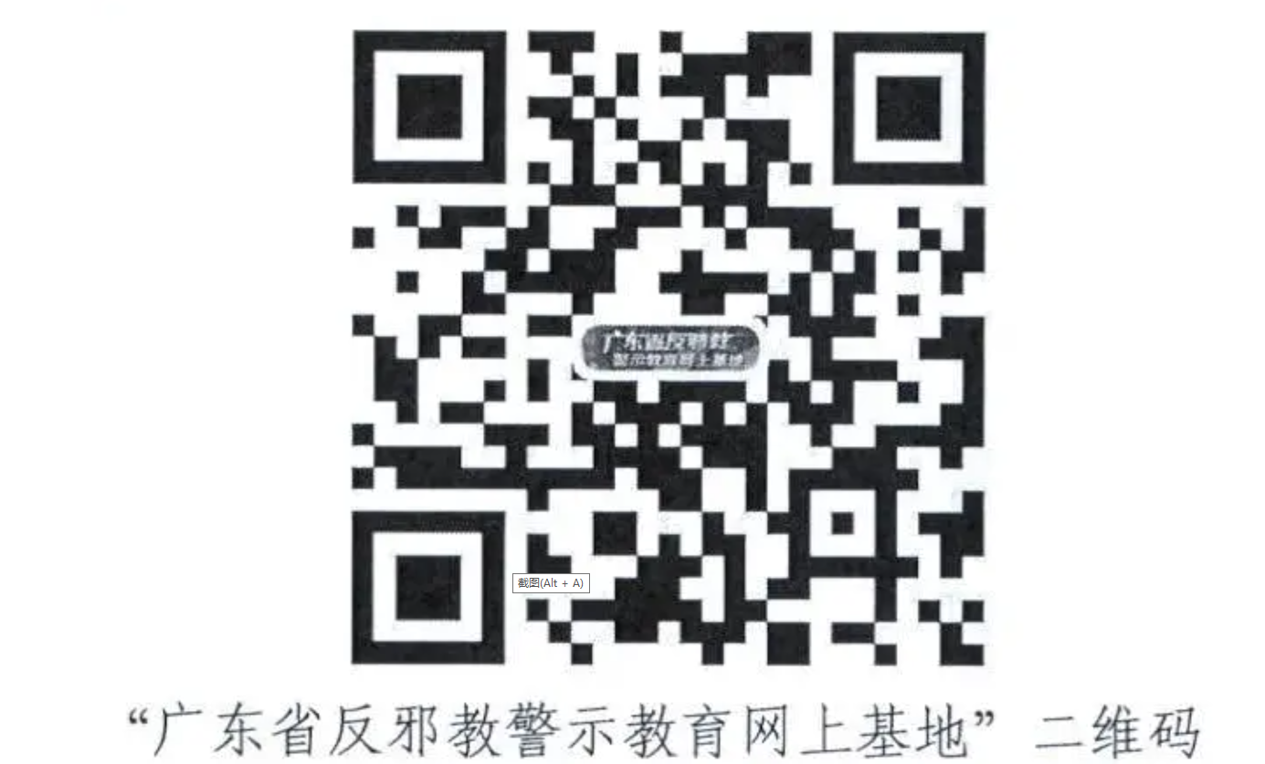 广东省反邪教警示教育网上基地现已正式上线,网民可通过广东政法网、广东省反邪教网、南方新闻网、“木棉雅韵”微信公众号和“广东反邪教”微博等入口进入“网上基地”,也可以访问网址:广东省反邪教警示教育网上基地(https://jyjd.southcn.com/)、南方新闻网络(www.southcn.com)、广东政法网(www.gdzf.org.cn)、广东省反邪教网(www.gdsfxj.com),还可以直接扫描二维码参观浏览。(信息来源/广东省委政法委 南方新闻网 广东省教育厅 编、审/党委宣传部)