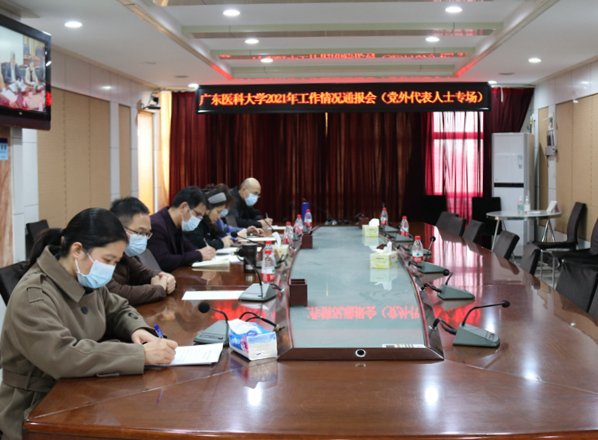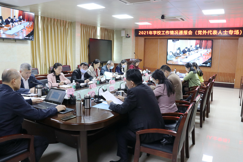 在通报会上,谭平带领党外人士代表领学了传达学习党的十九届六中全会精神,卢景辉和罗辉分别通报学校2021年主要工作情况。
