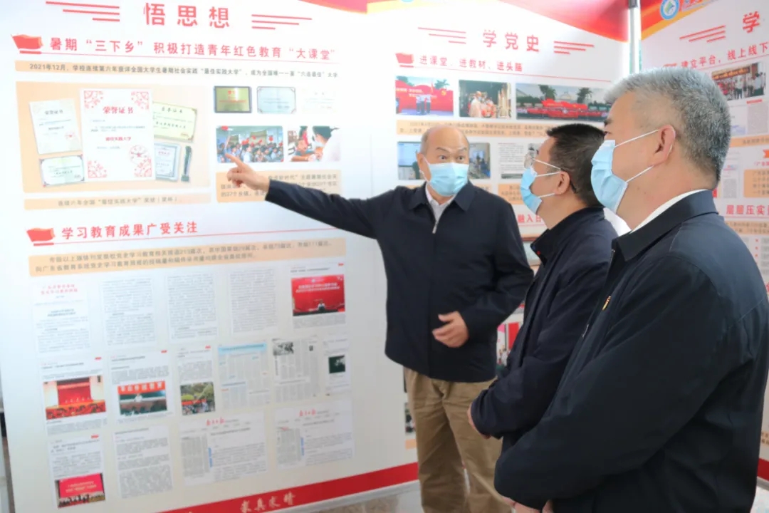 (卢景辉、袁新中、罗辉参观学校党史学习教育展板)