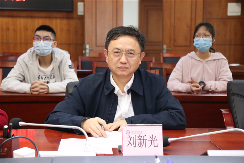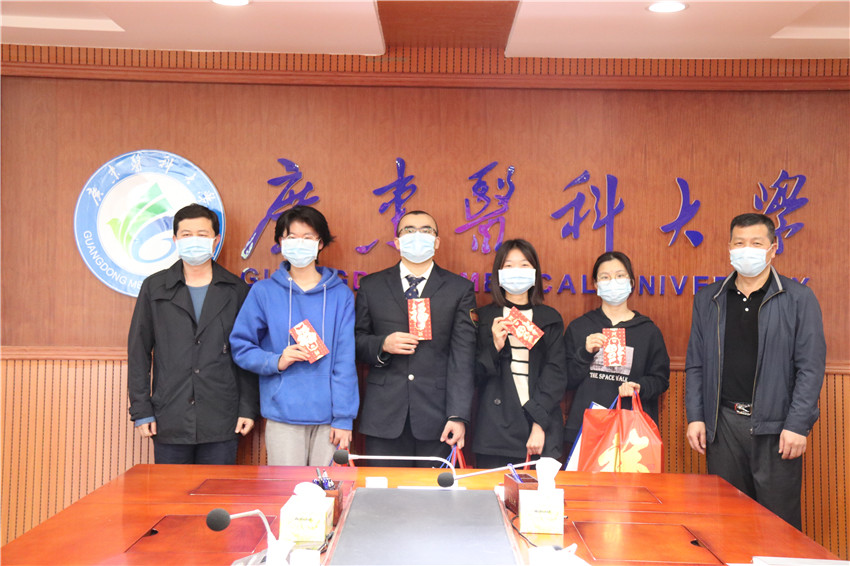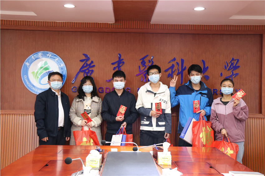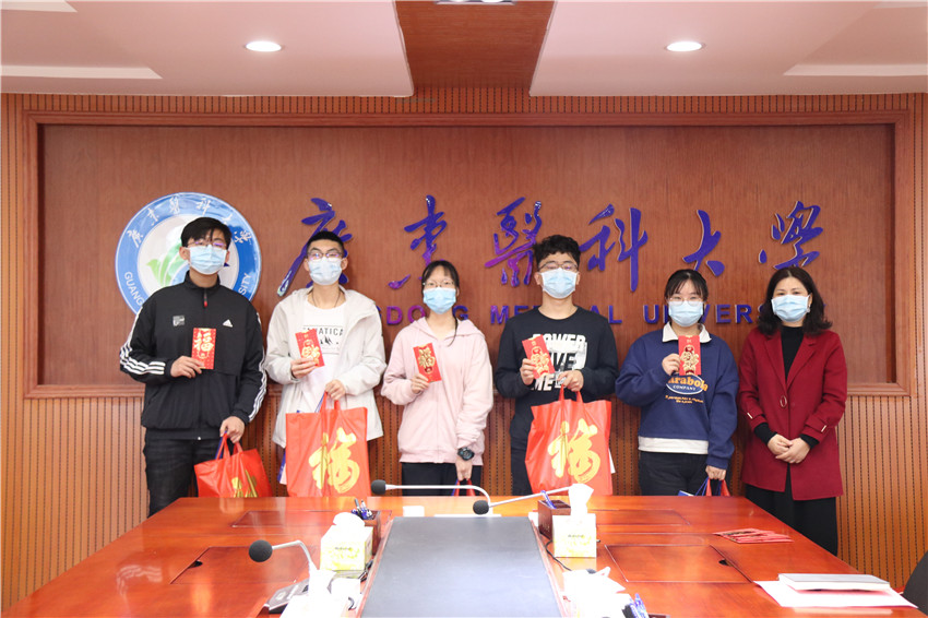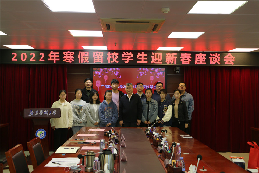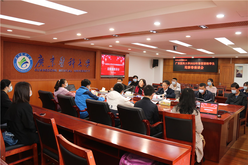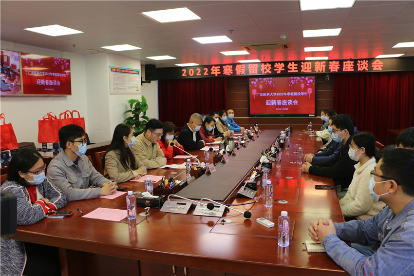 在听取完同学们的发言后,罗辉和刘新光分别作了热情洋溢的讲话。他们指出,在过去的一年里,学校党委按照党中央决策部署和省委工作要求,学党史、悟思想、办实事、开新局,扎实推进党史学习教育。学校连续六年获评全国大学生暑期社会实践“最佳实践大学”,学校党委获评“湛江市先进基层党组织”,附属医院党委和附属第二医院党委获评全省医院党建“四有”工程示范点。学校进入广东省高水平大学重点学科建设高校行列,4个学科晋升为省高水平大学重点建设学科。海东校区开工建设,建成科技大楼,附属医院海东院区一期工程全面封顶。学校始终坚持立德树人,坚持以学生发展为中心,进一步完善“我为师生办实事”机制,凝心聚力培育好时代新人。罗辉和刘新光勉励大家利用好假期在校时间,不断充实自己,实现自我管理和自我教育。并祝褔大家春节快乐、身体健康、吉祥如意!