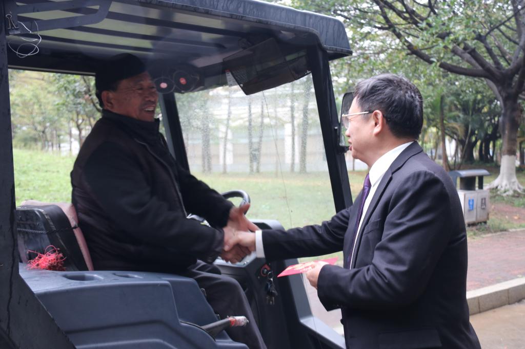 “感谢大家坚守岗位,辛苦了!”“新年好,给大家拜个年!”。每到一处,向献兵、刘新光都热情地与值班人员握手致意、亲切交谈,向他们送上慰问金和新年祝福。在慰问中,向献兵、刘新光认真询问了解值班人员工作和生活情况,对他们在春节期间舍小家顾大家,坚守岗位表示衷心地感谢,代表学校向在岗职工及其家属拜年。