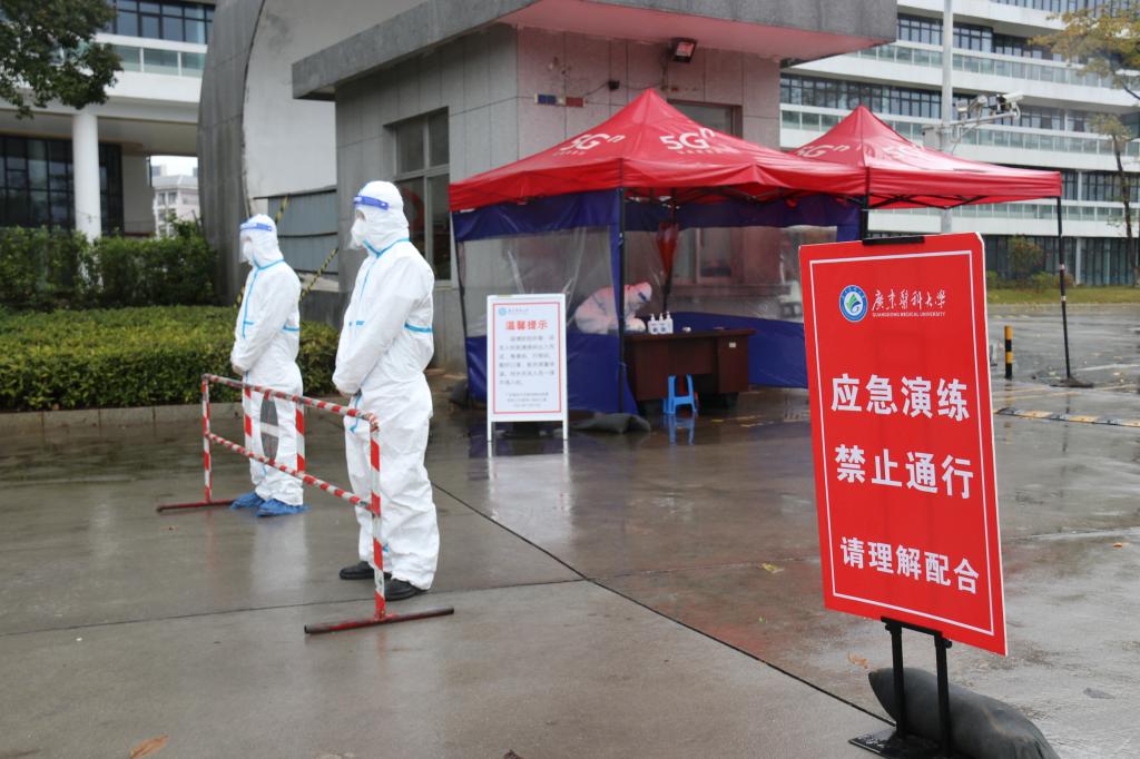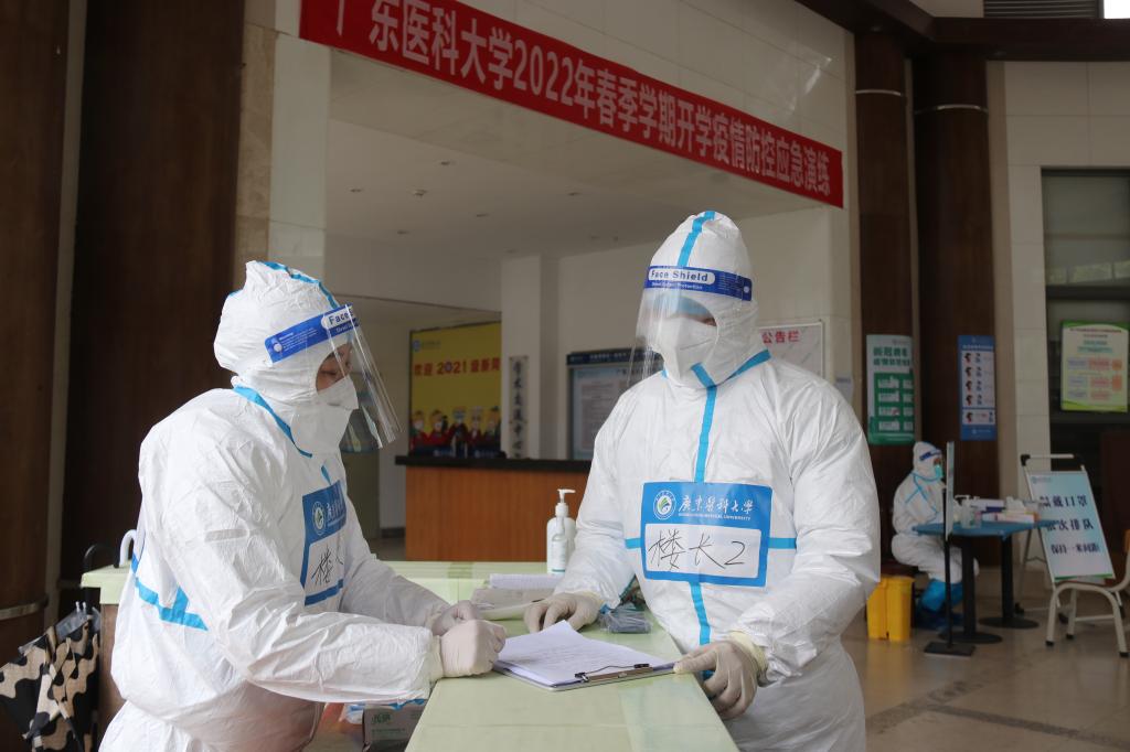 湛江市霞山区副区长、区防控办常务副主任刘春晖,霞山区卫健局局长徐晖,霞山区委组织部副部长、区防控办综合组组长谭光文,霞山区教育局廖锡锦副局长,湛江市疾控中心霞山站站长董小洁莅校指导观摩应急演练。学校领导、党委办公室、校长办公室、党委宣传部、医院管理处、党委学生工作部、安全保卫部、团委、人事处、后勤保障处、资产与实验室管理处、教育技术与信息中心、第一临床医学院、第二临床医学院、公共卫生学院、研究生院、人文与管理学院等单位有关人员参与演练。(文、编/王丽君 图/谭丽波 周圆 王丽君 审/冯锦山)