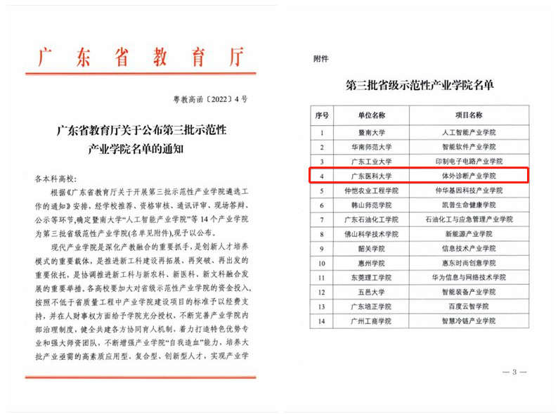 日前,广东省教育厅发布了《第三批示范性产业学院名单》,确定全省14个产业学院为第三批省级示范性产业学院,ac米兰医学技术学院申报的体外诊断产业学院成功入选。