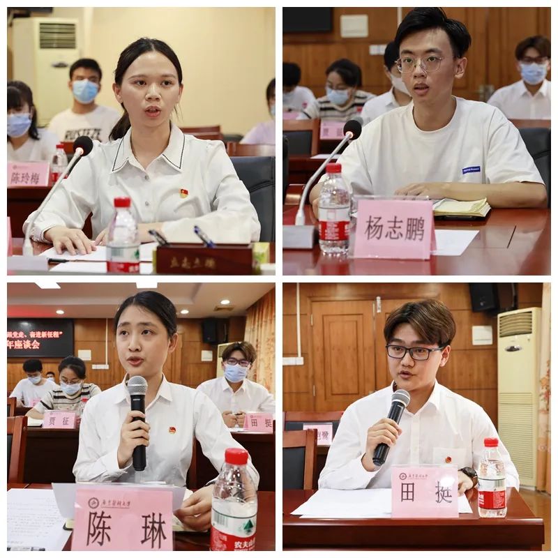 第二临床医学院的田挺、医学技术学院研究生杨志鹏、第二临床医学院陈琳、基础医学院研究生院梁茵茹、药学院研究生院刘薇、第一临床医学院符雅吟在座谈会上坚定的表明自己将坚持党的领导,立鸿鹄之志,做奋斗青年,在当今时代以最大的努力实现使命、创造历史,青年学生代表们呼吁青年在当今时代背景下要勇于担当,敢于担当,善于担当,踏实奋斗,在社会实践中锤炼自己,为实现“两个一百年”奋斗目标而努力学习、实践。