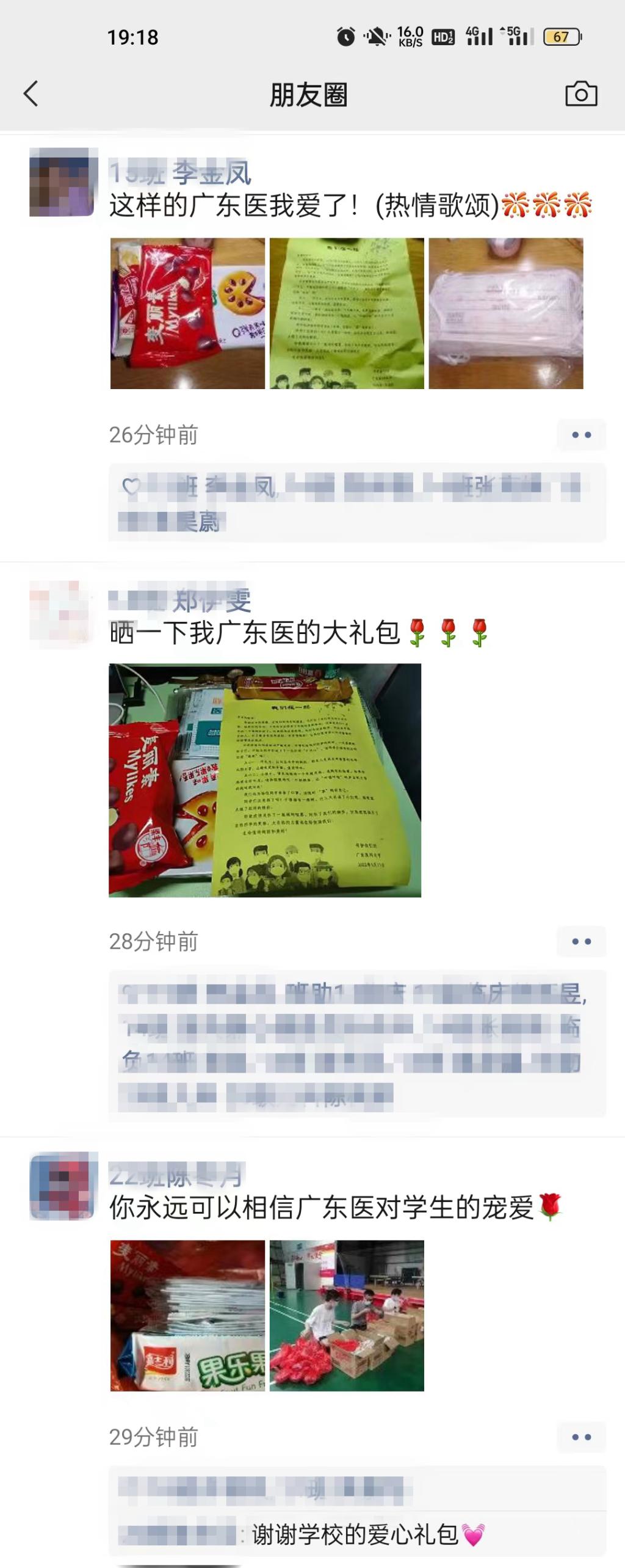 “开学到现在都没有买过口罩,都是学校准备的,真是把我们‘罩’顾得很好!”“非常好,有脆脆鲨!”“想什么来什么,感谢学校!”5月16日晚,湛江校区学生的朋友圈被刷屏了。学校的花样“宠”学生又多了一招,赠送健康小礼包,里面除了疫情防控必备的口罩,还有一些学生爱吃的小零食,很好地缓解了湛江市“0506”新冠肺炎本土疫情以来同学们心理压力和焦虑情绪。