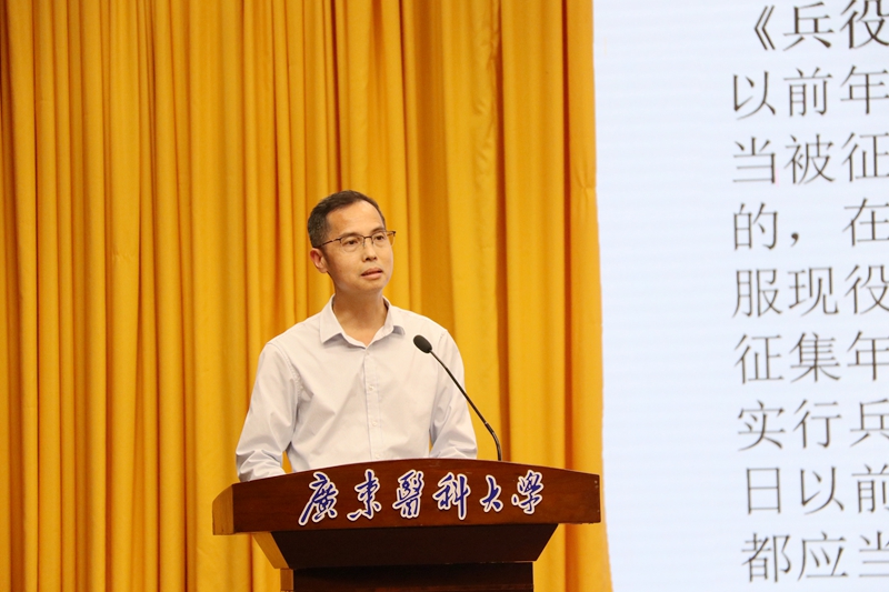 湛江市霞山区武装部部长曹健、副部长罗建明和湛江市征兵宣讲团到现场做征兵宣讲及进行国防教育。第一临床医学院党委书记谭秋浩,学工部、武装部征兵工作负责人员,毕业年级全体辅导员和毕业生代表出席了本次活动。