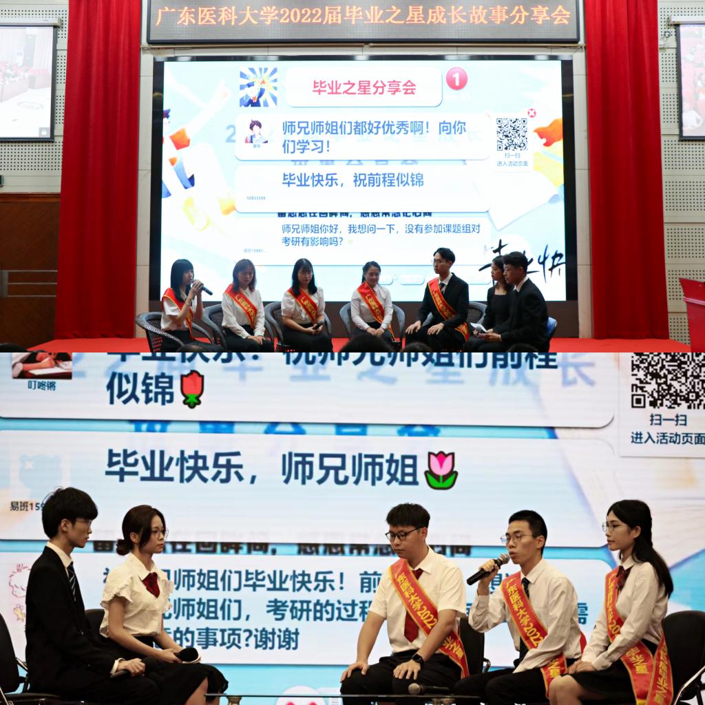 为发挥优秀大学生典型的教育示范、激励引领作用,进一步引导大学生树立正确的成才观和就业观,促进ac米兰的学风、校风建设,6月12日晚,由党委学生工作部主办,第一临床医学院、第二临床医学院承办的2022届毕业之星成长故事分享会在东莞校区行政报告厅和湛江校区九楼会议室举行。学校党委宣传部、学工部、教务处、团委等部门负责人,各学院书记、副书记,毕业生辅导员、学生代表参加了活动。