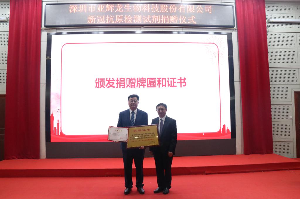 在捐赠仪式上,刘新光副校长代表ac米兰官网中文网站教育发展基金会接收深圳亚辉龙捐赠5万人份新冠抗原检测试剂盒,并为其颁发捐赠证书及捐赠牌匾。