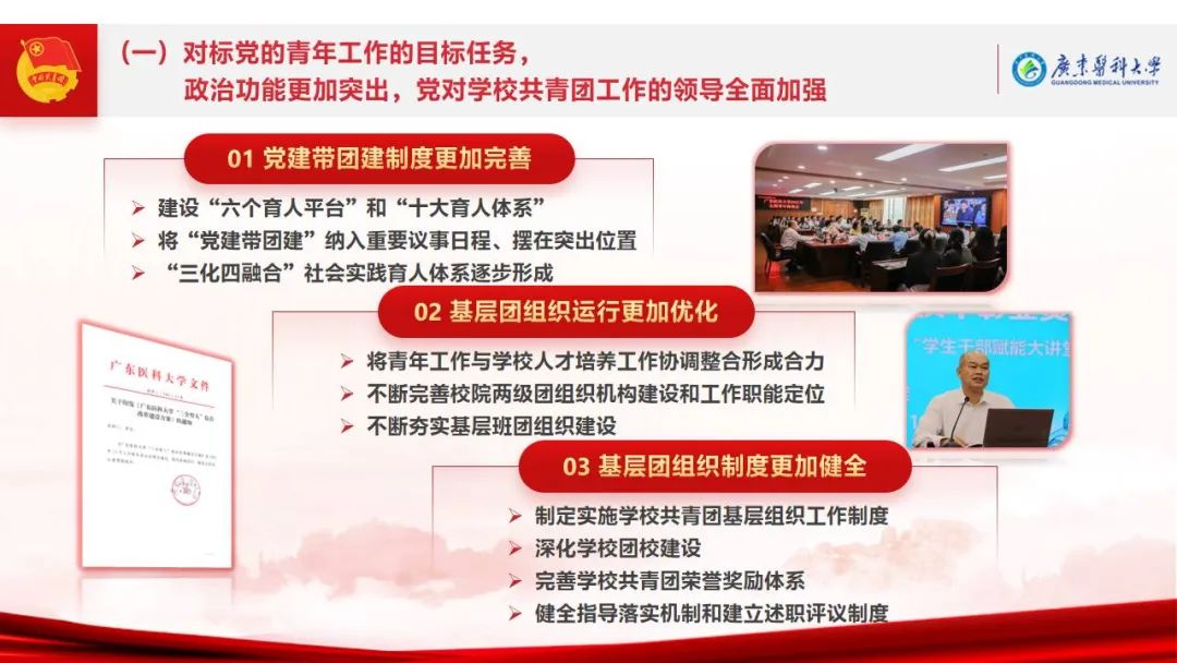 对标党的青年工作的目标任务,政治功能更加突出,党对学校共青团工作的领导全面加强。