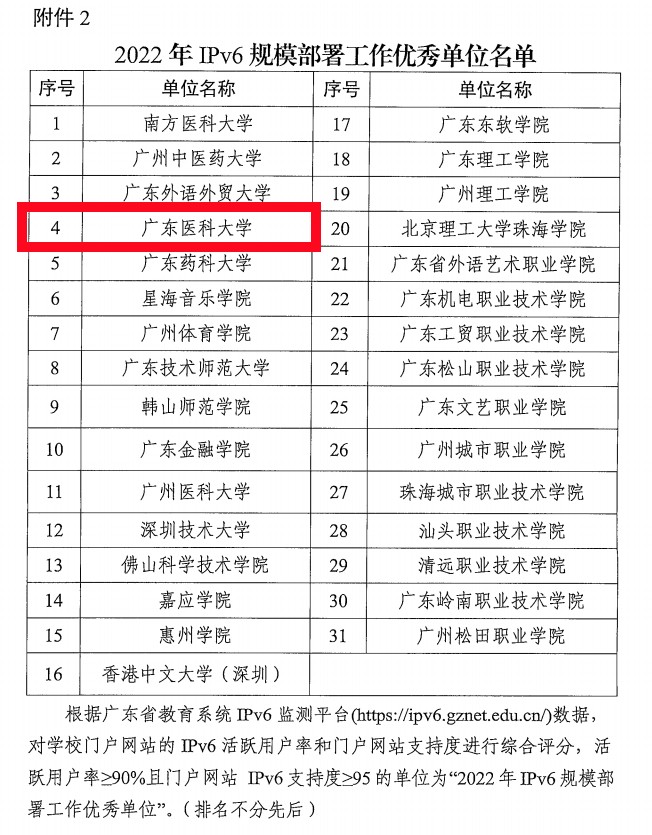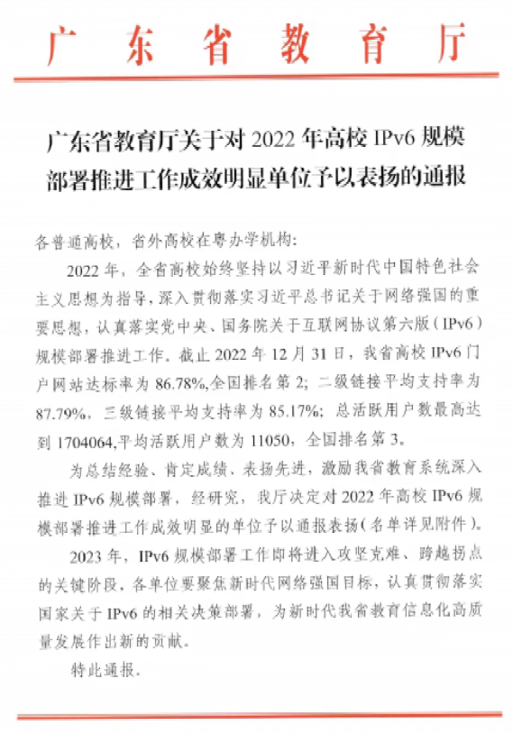 日前,广东省教育厅发布了《广东省教育厅关于2022年高校IPv6规模部署推进工作成效明显单位予以表扬的通报》,文件依据广东省教育系统IPv6监测平台2022年监测全省各高校的门户网站支持度、IPv6活跃用户率、IPv6总流量、应用网站等各项指标数据的综合评分情况,对全省2022年高校IPv6规模部署推进工作成效明显的单位予以通报表扬,其中包括标杆单位10个、优秀单位31个和积极推进单位12个,ac米兰获评“2022年IPv6规模部署推进工作优秀单位”称号,成为全省31个获此表彰高校之一。