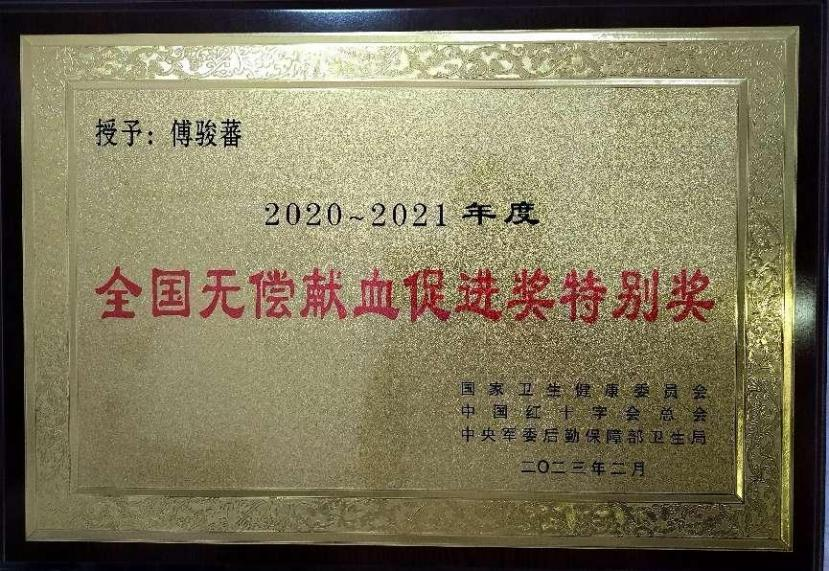 ac米兰医院管理处傅骏蕃同志荣获“2020-2021年度全国无偿献血促进奖特别奖”。据悉,广东省获此奖项的集体(或人员)只有5个,傅骏蕃同志为东莞市唯一获此殊荣人员。