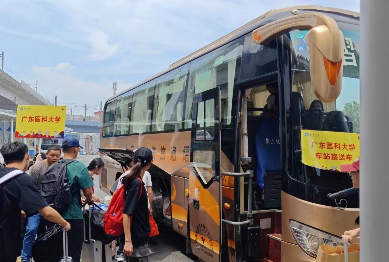 来自茂名的新生陈婕同学表示:“刚下站点的时候,还以为要一个人打车回校,很怕找不到路怎么办,幸好一出站口就看到了学校志愿者拉起的横幅,并且热心指引带到学校设置的车站点,学校给安排了专车接送真的好贴心。”
