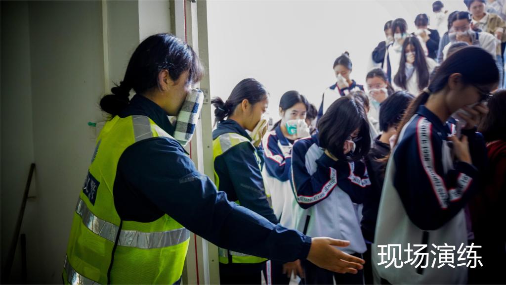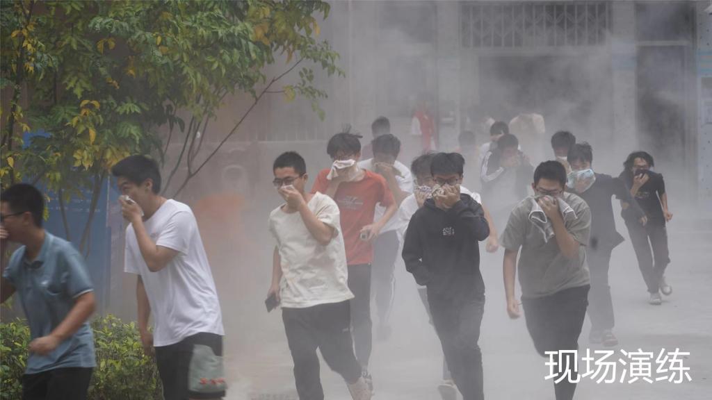 楼内学生听到警报提醒后,在疏散引导组的引导下紧急撤离。他们用湿毛巾捂住口鼻、屈身弯腰,快速有序地向安全地带疏散。