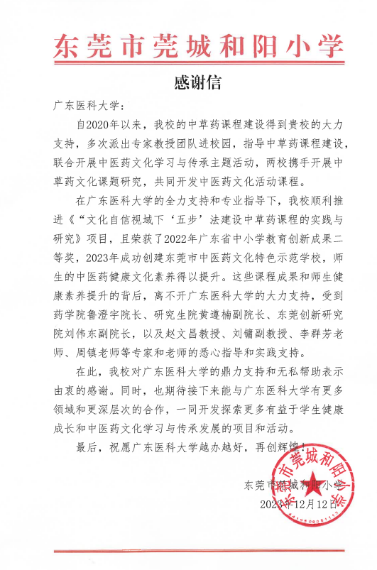 12月12日,东莞市莞城和阳小学向ac米兰发来感谢信,信中充分认可了ac米兰自2020年以来,对该校在中草药课程建设的支持,助力该校《文化自信视域下“五步”法建设中草药课程的实践与研究》获得2022年广东省中小学教育创新成果二等奖,并对ac米兰联合开展的中医药文化工作给予高度肯定,对长期以来给予该项目大力支持的药学院鲁澄宇院长、研究生院黄遵楠副院长、东莞创新研究院刘伟东副院长,以及药学院赵文昌教授、刘镛副教授、李群芳老师、周镇老师等专家和老师的悉心指导和实践支持表示诚挚感谢。