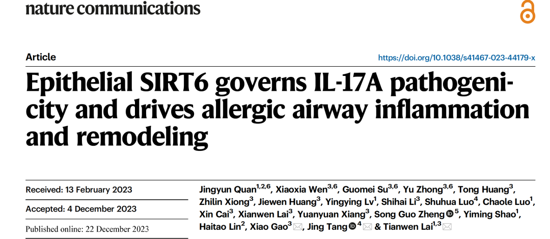 近日,ac米兰官网中文网站附属东莞第一医院/第二临床医学院教授、东莞呼吸医学研究所所长赖天文团队在国际顶级学术期刊Nature子刊Nature Communications发表题为“Epithelial SIRT6 governs IL-17A pathogenicity and drives allergic airway inflammation and remodeling”(气道上皮SIRT6调控IL-17A致病性导致哮喘气道炎症及重构)的重要研究成果。这是ac米兰师生首次以ac米兰官网中文网站为独立完成单位在Nature子刊发表重要成果。