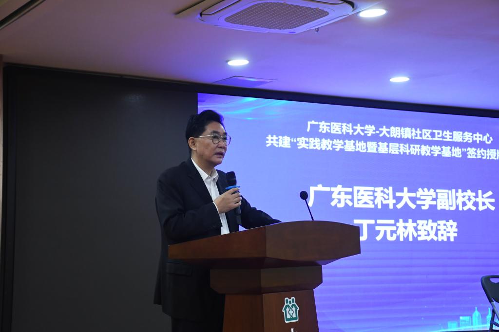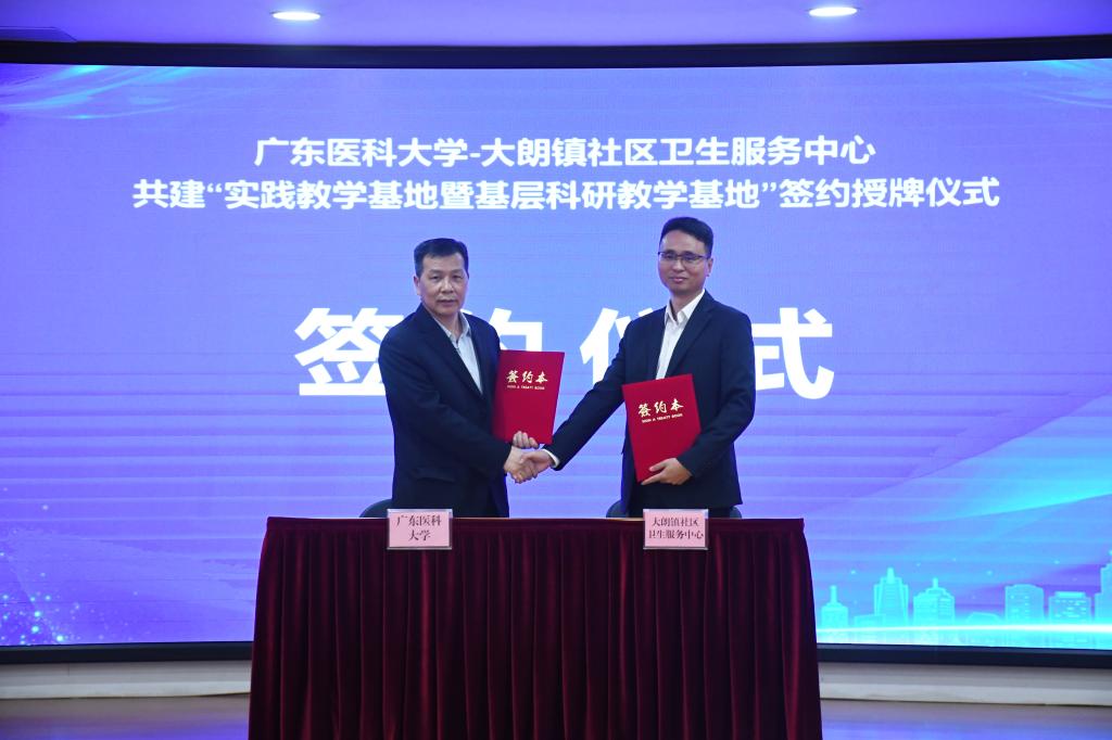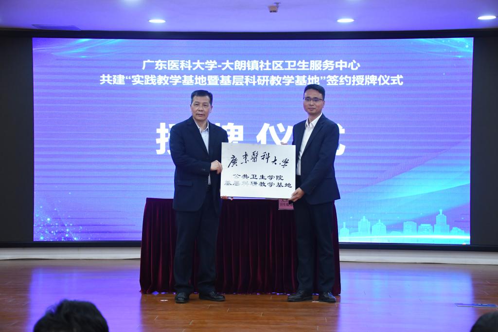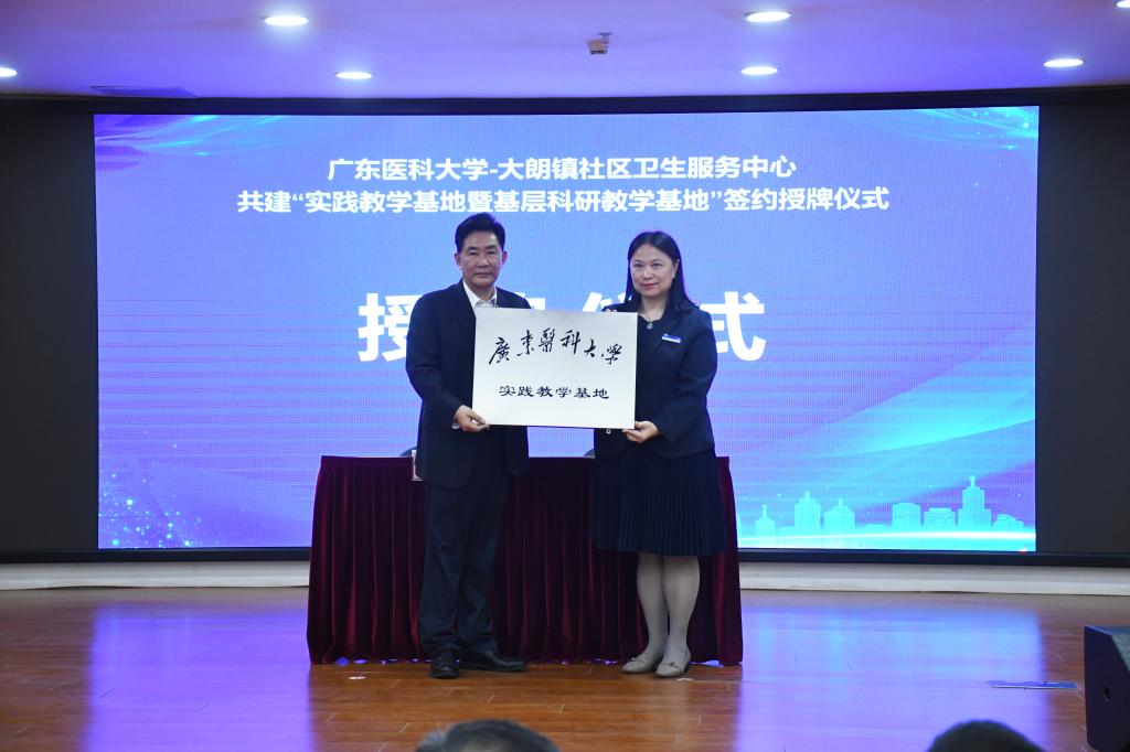 大朗镇副镇长张敏莉,大朗镇卫生健康局党支部书记、局长彭衬儿和党支部副书记叶庆强,学校副校长丁元林、公共卫生学院班子成员及各系室主任,大朗镇社区卫生服务中心班子成员等共同见证签约授牌仪式。