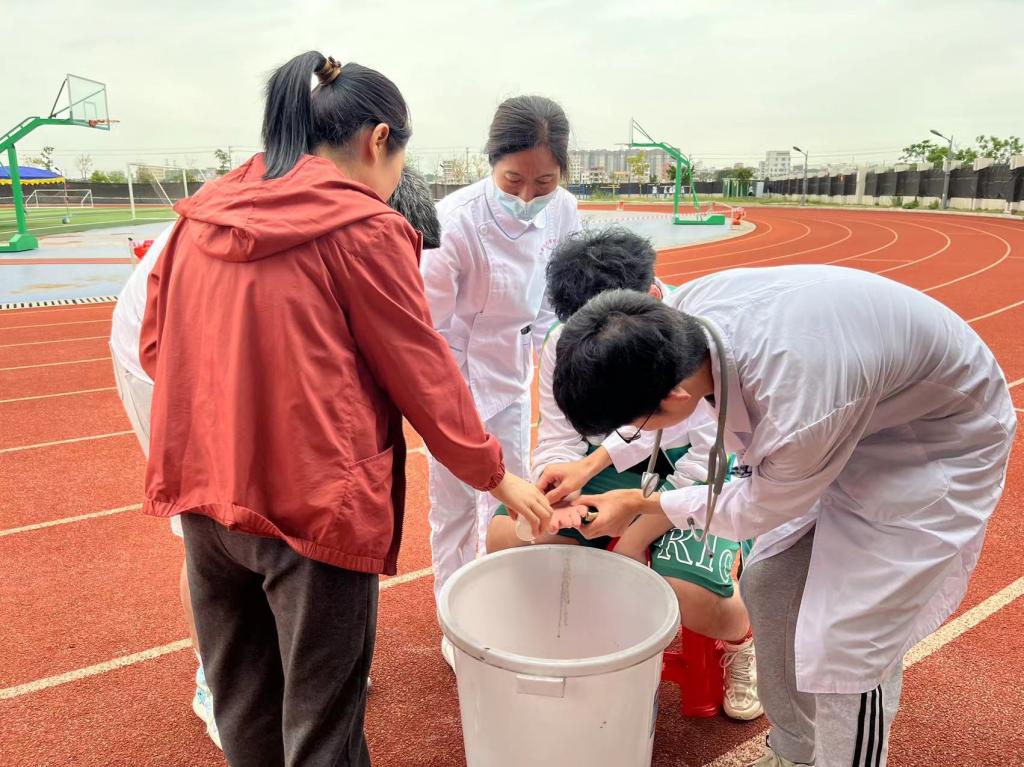 医护人员贴心地在跑道终点准备充足的葡萄糖水,服务每一批奋进全力冲刺的学生,如发现有学生不适,就第一时间上前搀扶,询问评估情况,给予必要的生命支持。负责值守的李医生表示,有个别学生考后不适,紧急转运至医疗补给点,给予对症处理后,情况稳定,都已经联系学生家长转院进一步就诊。(文、图/周圆 审核/杨丹 复核/周圆 审发/裴金涛)