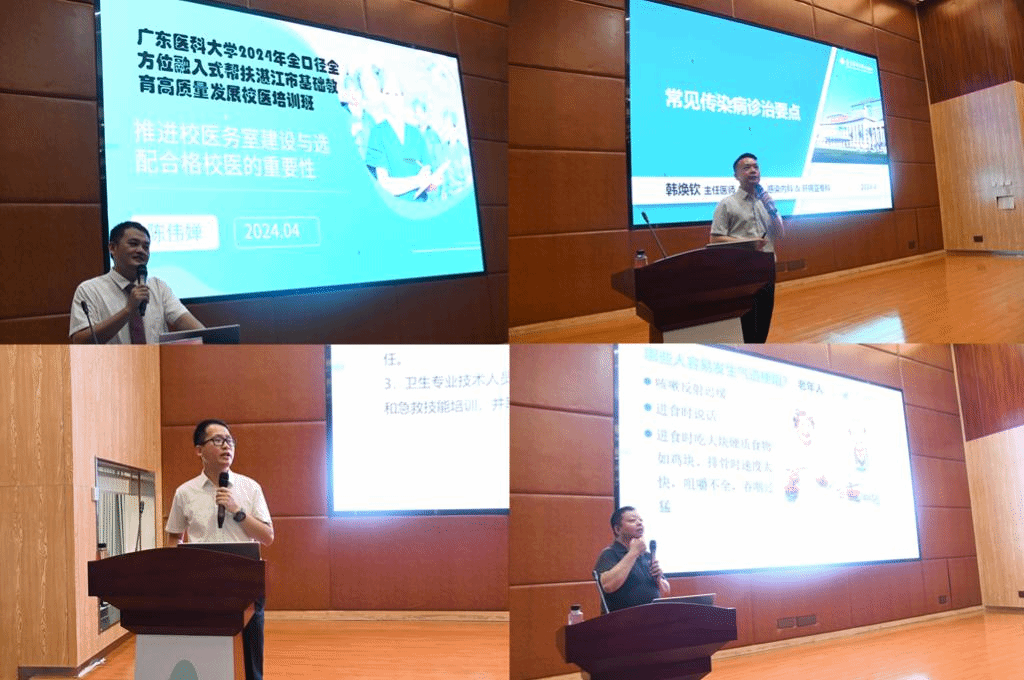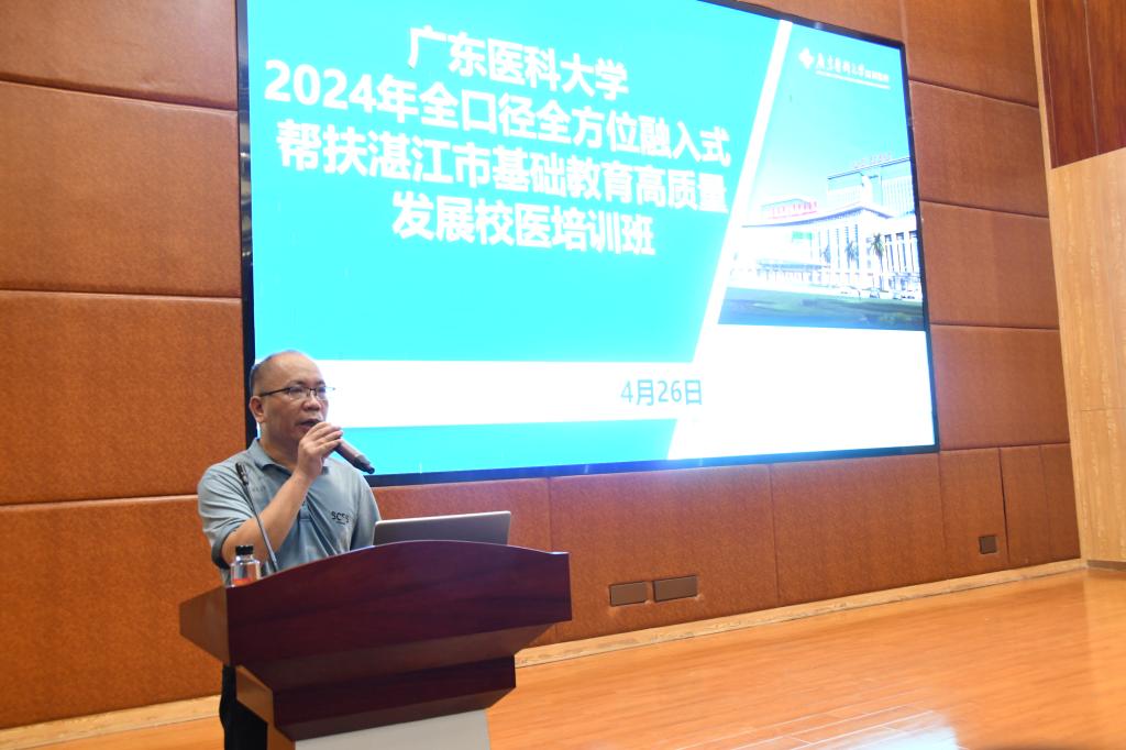 2024年4月26日上午,ac米兰官网中文网站2024年全口径全方位融入式帮扶湛江市基础教育高质量发展校医培训在ac米兰官网中文网站附属医院全科医生培养基地开班,来自湛江市各县、区中小学校的80名校医参加培训。湛江市教师发展中心副主任、湛江市教育研究院副院长蔡茂青出席开班仪式。培训由继续教育学院统筹,附属医院承办。