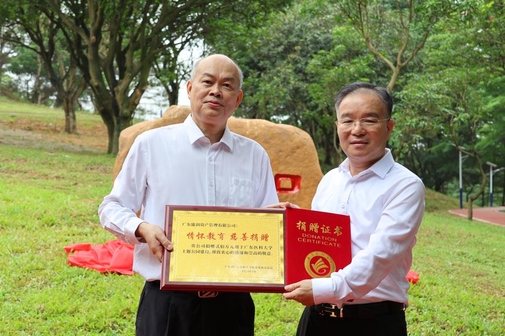 “知园”和“求真亭”由广东能润资产管理有限公司捐资建设。广东能润资产管理有限公司张能勇董事长一直热心教育、医疗公益事业,关心支持学校的建设发展,不仅捐资200万建设学校的“知园”,捐赠1000万在附属医院建设“学术报告厅”,设立“名医学者培育基金”和“学术交流基金”。在张能勇董事长的大力支持下,学校还“牵手”蕉岭,打造“百千万工程”县域医疗卫生能力提升“蕉岭模式”,并共建“健康科技小院”,为学校实现大学的价值提供了资金和平台的支持。