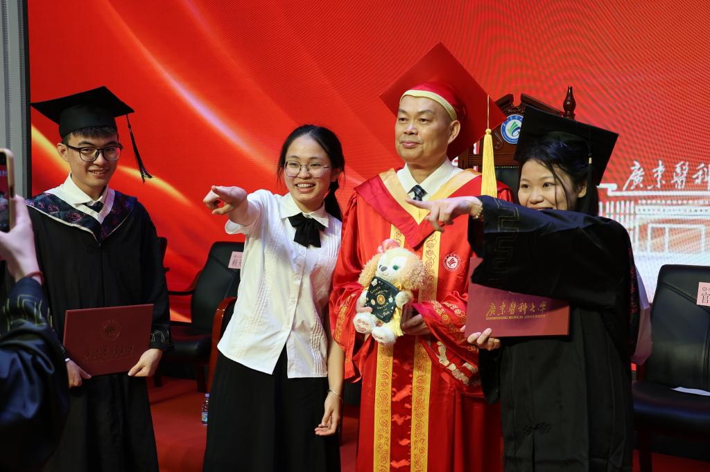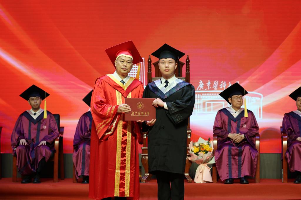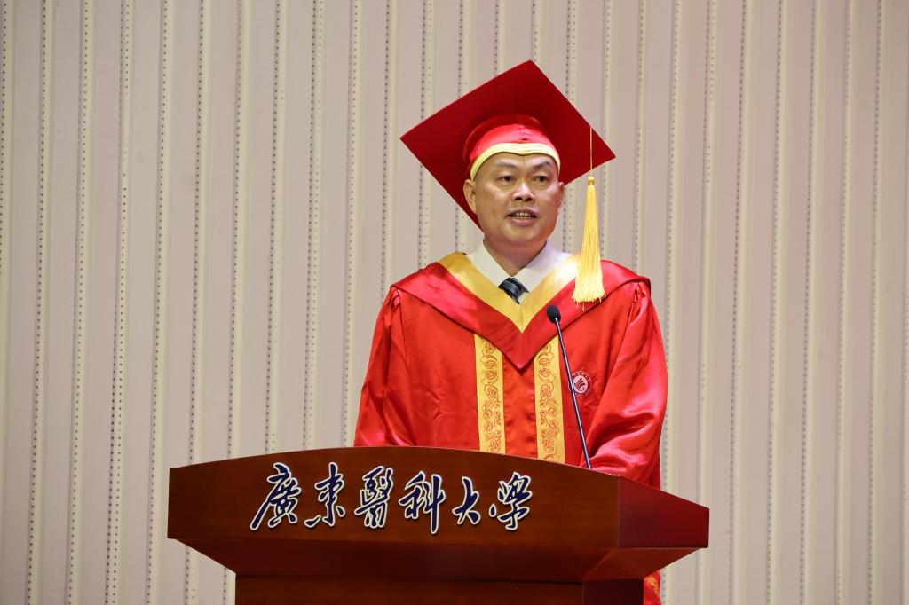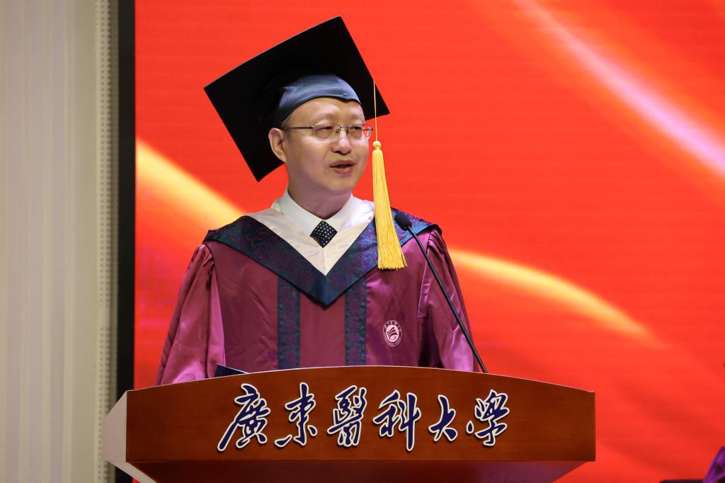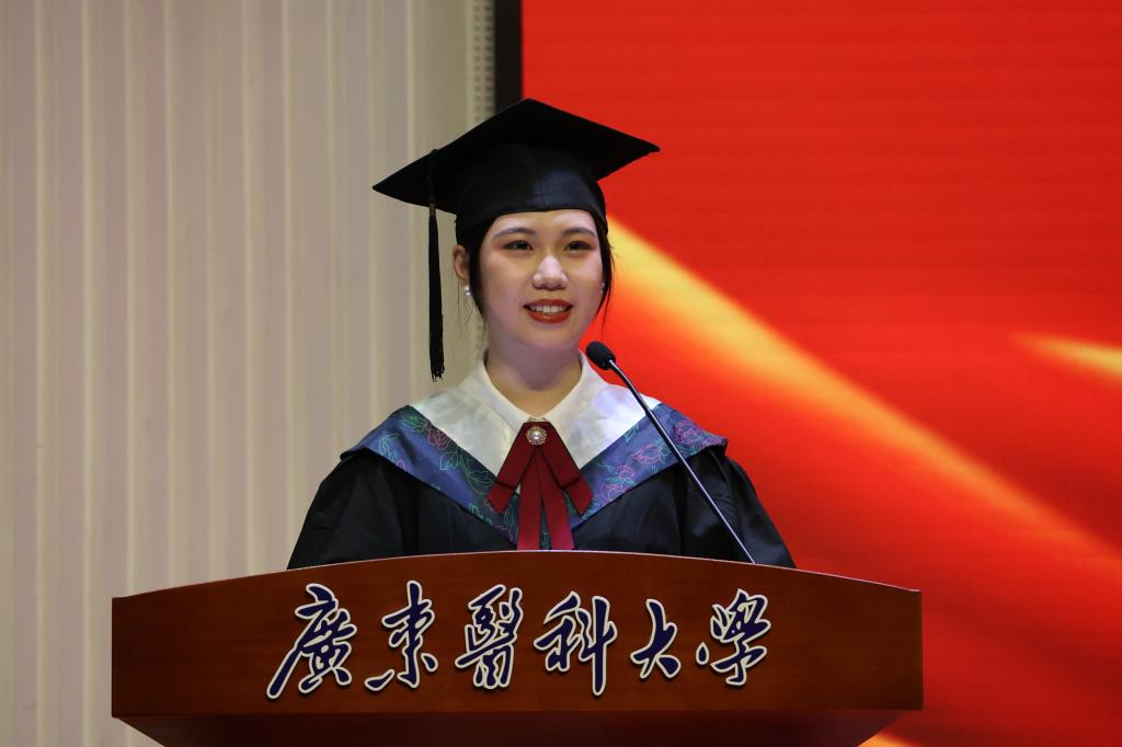 研究生毕业生代表、第一临床医学院黄总封表示,这三年在老师们的辛勤指导下,我们在广医经历了成长的蜕变,体验了艰辛,也收获了喜悦,最终明白了幸福是靠奋斗出来的。从开始对研究生生活的不适应,到现在毕业在即的依依不舍;从开始的科研小白,到现在对科研的喜欢。有太多的不舍,不舍离开学校、不舍离开辛勤培育我们的老师。工作十年再读研的“最强奶爸”重回学校,感受师恩,倍感亲切!得此师恩,将会成为我往后人生的道路上勇往直前、乘风破浪的动力。我会将这种爱传到每一个病人身上。