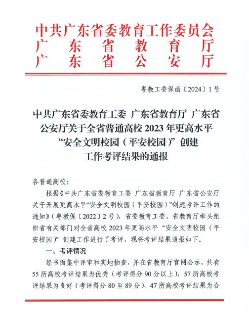 近日,中共广东省委教育工作委员会、广东省教育厅及广东省公安厅联合通报全省普通高校2023年度更高水平“平安校园”创建工作考评结果,ac米兰在160所参评高校中脱颖而出,荣获2023年度广东省更高水平安全文明校园优秀等级。ac米兰已连续两年获得省级优秀等次。