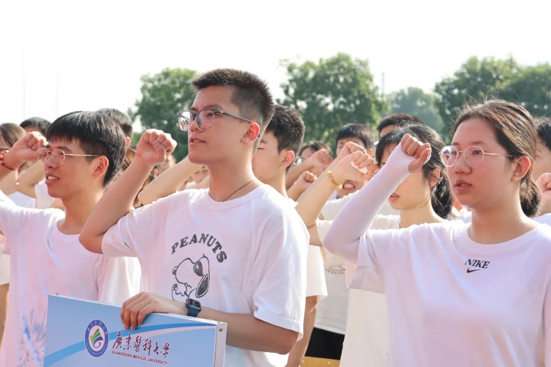 开学典礼上新生庄严宣誓:践行“立志立德,求真求精”之校训,秉承“艰苦奋斗,自强不息”之精神,尊师爱校,严谨诚实,勤恳好学,文明守纪,团结奋进,追求卓越,弘扬正能量,提升精气神,为实现健康中国梦和中华民族伟大复兴而努力奋斗。