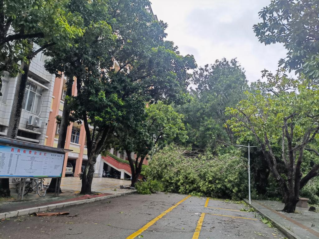 台风肆虐后,校园里不少树木东倒西歪,横倒在校道上。个别场地的铁皮已被吹裂甚至吹飞。湛江校区翠竹路一棵20米高、树龄超50年的“桃花心”树被吹倒,横跨在翠竹路东段路面(新教学楼前),桃李园也有一棵6米左右的木棉花树被刮倒在地,大量树枝树叶被风吹落。