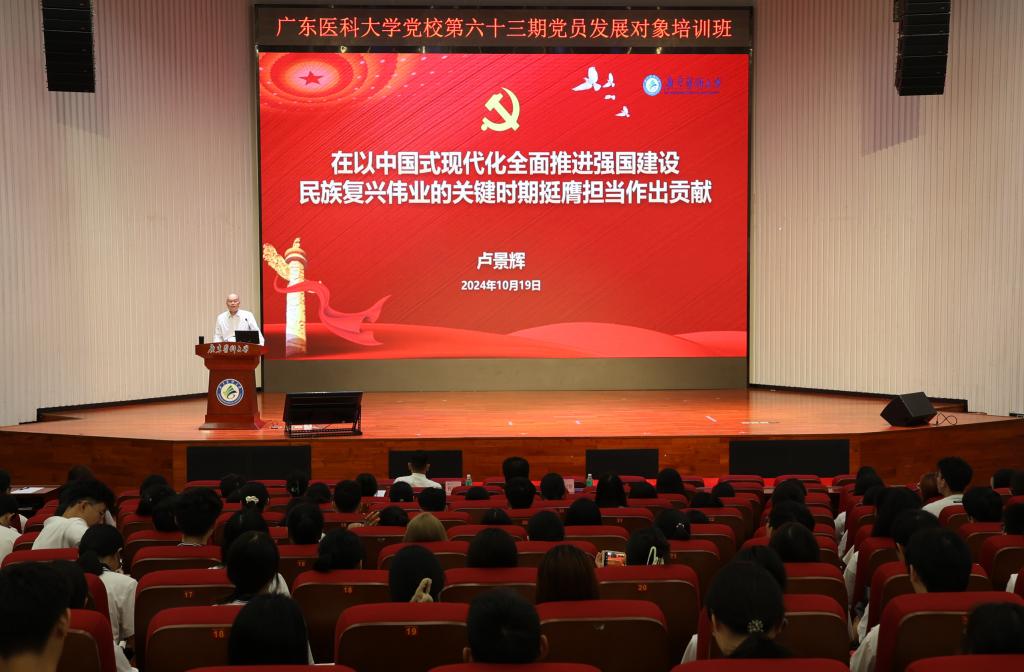 为进一步深入学习贯彻习近平新时代中国特色社会主义思想和党的二十届三中全会精神,进一步加强对党员发展对象的培养和教育,确保新党员发展质量,抓实党员队伍建设,10月19日,学校党校组织开展第六十三期党员发展对象培训。学校党委书记、校长、党校校长卢景辉为全体学员上首场专题党课暨2024年秋季学期思政课。