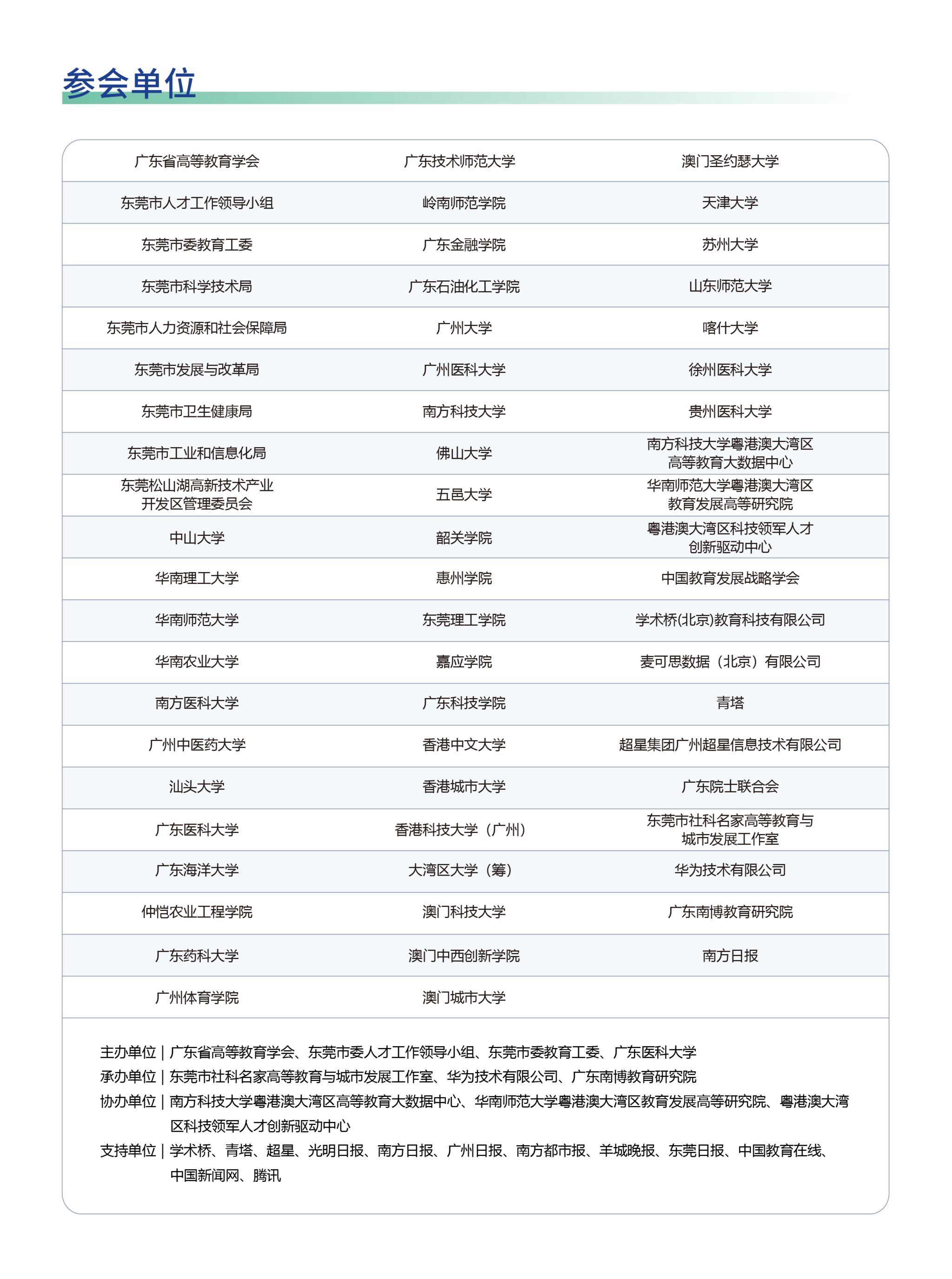 本次活动主要由东莞市社科名家曾志嵘高等教育与城市发展工作室、华为技术有限公司和广东南博教育研究院承办,除受邀前来的省内外40余家高校书记与校长、科研院所领导外,还有部分知名的第三方智库负责人和媒体代表。此外,参加大会的还有东莞市人大常委会党组书记、主任骆招群,东莞市委常委、宣传部长武一婷,东莞市委常委、组织部长吕元元,东莞市委组织部常务副部长姚家庆,东莞社科联主席张卫红,东莞市委组织部、东莞市发展改革局、教育局、科技局、工业和信息化局、人力资源和社会保障局、卫生健康局等单位负责人,以及ac米兰官网中文网站全体中层干部和部分教师、学生代表。(文、图/宣传部 初审/王丽君 复核/裴金涛 审发/杨海云)