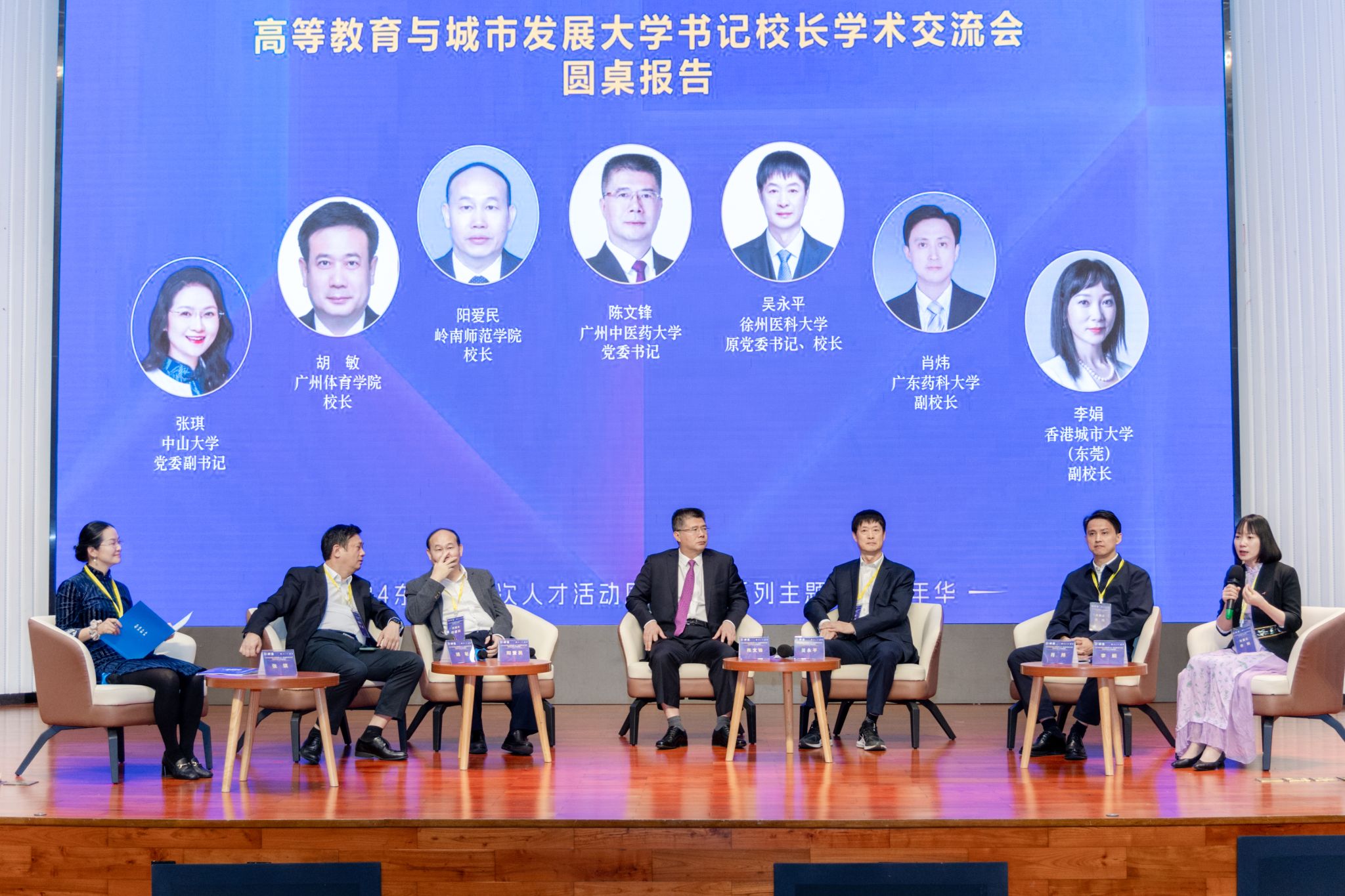 会议的圆桌交流会议也非常热烈。中山大学党委副书记张琪在主持圆桌交流时指出,高等教育和城市发展是命运共同体,中山大学的发展离不开大湾区省市的鼎力支持,未来也会进一步聚焦国家战略和粤港澳大湾区发展,努力做出新的更大贡献。香港城市大学(东莞)李娟副校长指出,大学要利用自身在科研、人才、文化等方面的资源和优势,创作科技之城、文化之城,打造人才高地,服务城市发展。岭南师范学院校长阳爱明、广州体育学院校长胡敏、徐州医科大学原书记校长吴永平、广东药科大学副校长肖炜结合各自大学的发展,一致强调了大学与城市互动共生、相互塑造、相互成就的观点。