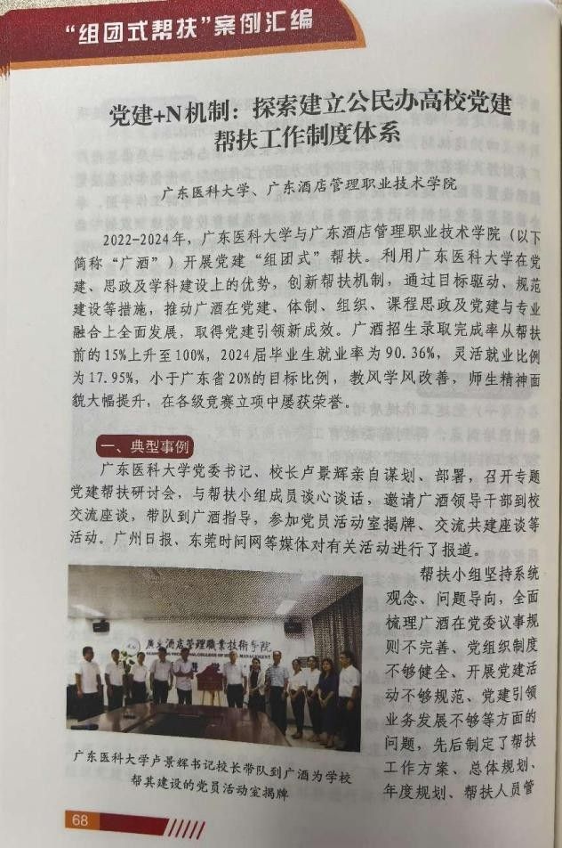 近日,中共广东省委教育工作委员会印发《公民办高校党建“组团式”帮扶工作典型案例》,ac米兰与广东酒店管理职业技术学院共同撰写的党建“组团式”帮扶工作典型案例《党建+N机制:探索建立公民办高校党建帮扶工作制度体系》成功入选。