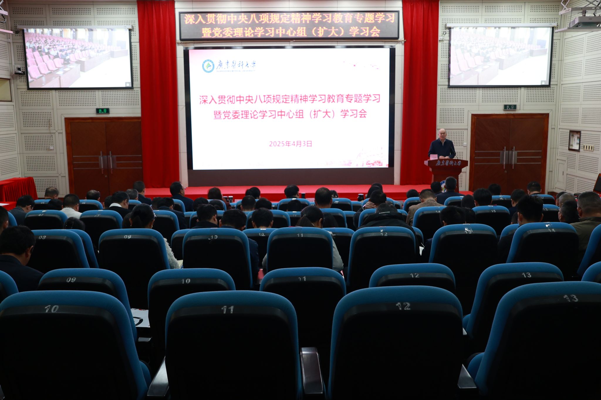 2025年4月3日下午,学校在两校区报告厅举办校级领导班子深入贯彻中央八项规定精神学习教育读书班暨党委理论学习中心组(扩大)学习会。会议由学校党委书记、校长卢景辉主持。党委理论学习中心组全体成员、校领导及全体中层干部参加学习。