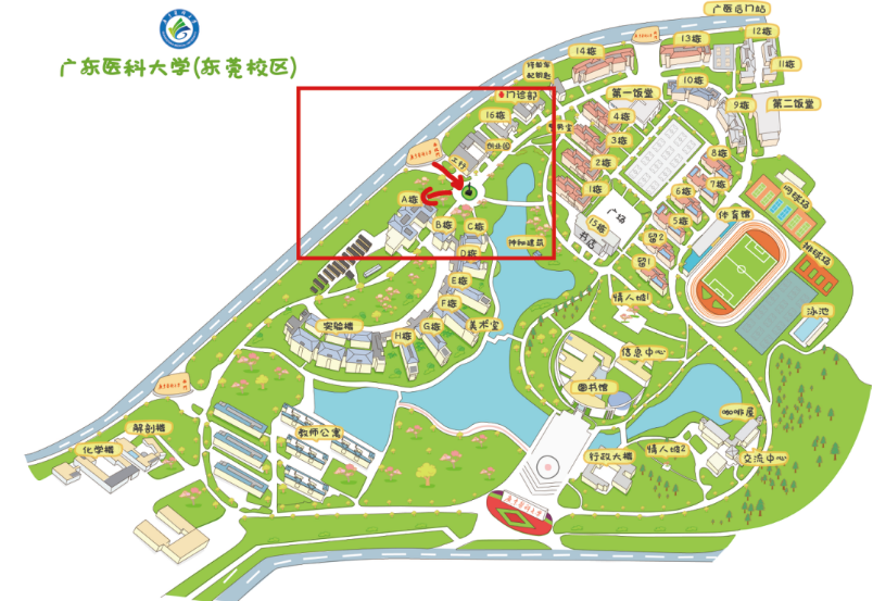 为确保安全有序,考生仅能从ac米兰官网中文网站东莞校区西北门(导航定位地址:中国工商银行(东莞广医支行))进入校园。学校不设停车区,不能自驾进校。建议搭乘公共交通,公共汽车307路、329路、338路、351路、710路、莞312路可到达ac米兰北门,公交站名为“广医后门”站,下车后向北约步行500米)。打车可定位“中国工商银行(东莞广医支行)”。离校时人多聚集会增加打车的难度,建议提前预约好车。学校平面图如下: