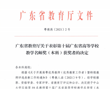 9月8日,广东省教育厅公布2021年度第十届广东省高等学校教学名师(本科)获奖者。ac米兰张良清、唐焕文教授获评第十届广东省高等学校教学名师奖。