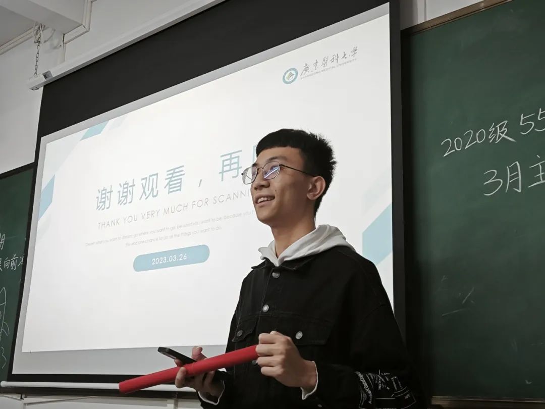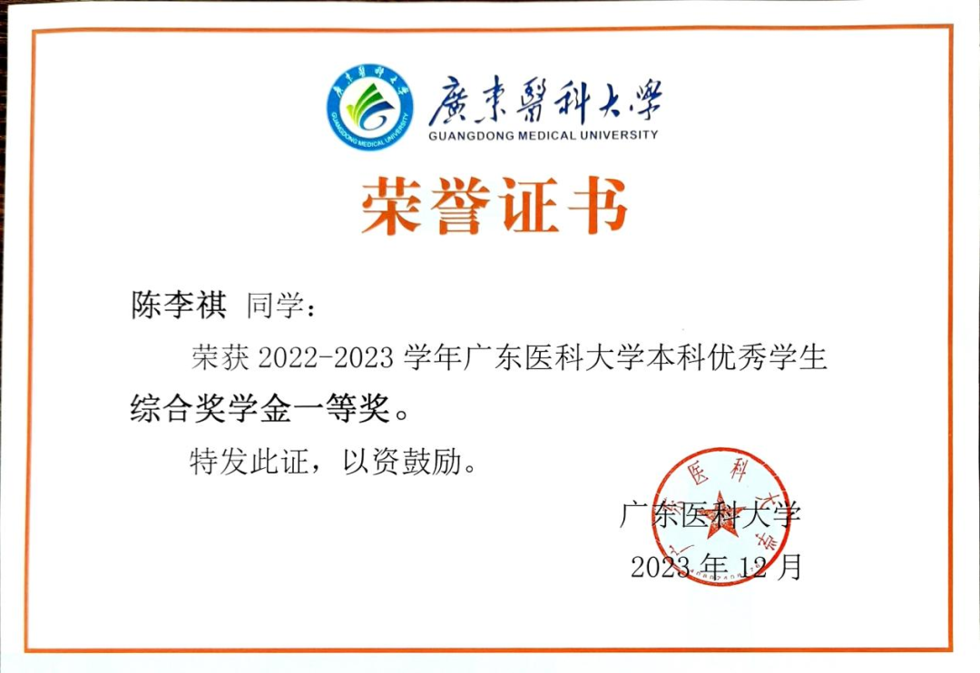 陈李祺现任2020级临床医学专业卓越班班长,除积极开展班级特色活动外,他和班委团也重抓班级学风,带领班级先后获得“优良学风标兵班”“零补考班”“阳光体育班”等多项集体荣誉。班级德智体美劳全面发展,目前团支部发展党员(含预备党员)达半数,不仅学业上0人补考,班级学业加权成绩位于年级第1,并且班级成员在简历制作大赛、临床技能大赛等校园各类竞赛中也大放光彩。其中,他策划开展的“早临床早实践,唱响青春之歌”主题班会系列活动,荣获学院“3月主题班会优秀案例”。他担任班级干部期间,荣获“湛江市优秀学生骨干”“优秀学生干部”“优秀共青团干部”称号。