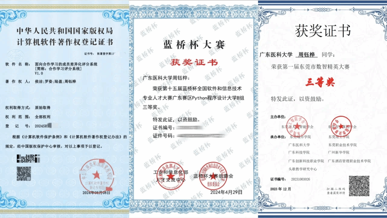精进学业之余,周钰桦还积极参与各类重要赛事并斩获奖项,包括全国大学生生物医学工程创新设计竞赛三等奖、蓝桥杯全国软件和信息技术专业人才大赛广东赛区Python程序设计大学B组三等奖等。