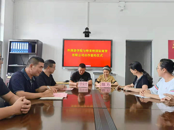 7月6日下午,外国语学院与深圳特里特国际商贸有限公司开展校企合作签约仪式在学院5楼会议室隆重举行。学院党政班子领导、党委委员、教师代表以及深圳特里特国际商贸有限公司执行董事田小勇出席了本次签约仪式,共同见证了这一重要时刻。