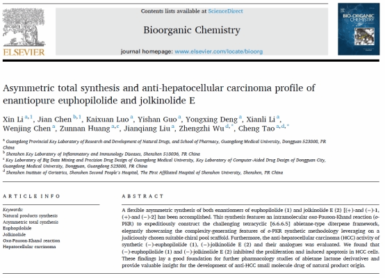 近日,药学院陶成博士团队针对松香烷内酯型天然产物jolkinolide E和euphopilolide成功发展了一条针高效的不对称合成路线。该研究以“Asymmetric total synthesis and anti-hepatocellular carcinoma profile of enantiopure euphopilolide and jolkinolide E”为题,在线发表于在知名化学期刊Bioorganic Chemistry(doi:10.1016/j.bioorg.2023.106688)上。药学院硕士研究生李鑫为论文的第一作者,陶成博士为通讯作者(ac米兰官网中文网站为第一署名单位)。