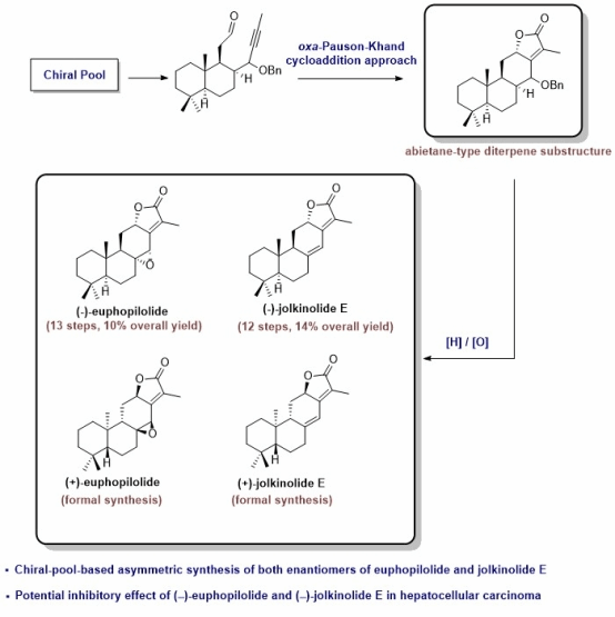 陶成博士团队从手性源出发,通过关键的oxa-Pauson-Khand反应,高效地构建了松香烷内酯型天然产物四环骨架;在此基础上,实现了松香烷内酯型大戟二萜(−)-jolkinolide E的不对称全合成(12步,总收率14%)和(−)-euphopilolide的首次不对称全合成(13步,总收率10%);并且完成了(+)-jolkinolide E和(+)-euphopilolide的形式合成;此外,对目标产物和结构衍生物进行了初步的抗肝细胞癌活性评价,发现(−)-euphopilolide和(−)-jolkinolide E对Hep3B和Huh7细胞体现出中等强度的抑制活性。该工作进一步拓展了oxa-Pauson−Khand反应在复杂二萜类天然产物中的应用,为松香烷内酯型大戟二萜展开广泛的生物活性研究以及相关生物学构效关系研究奠定基础。