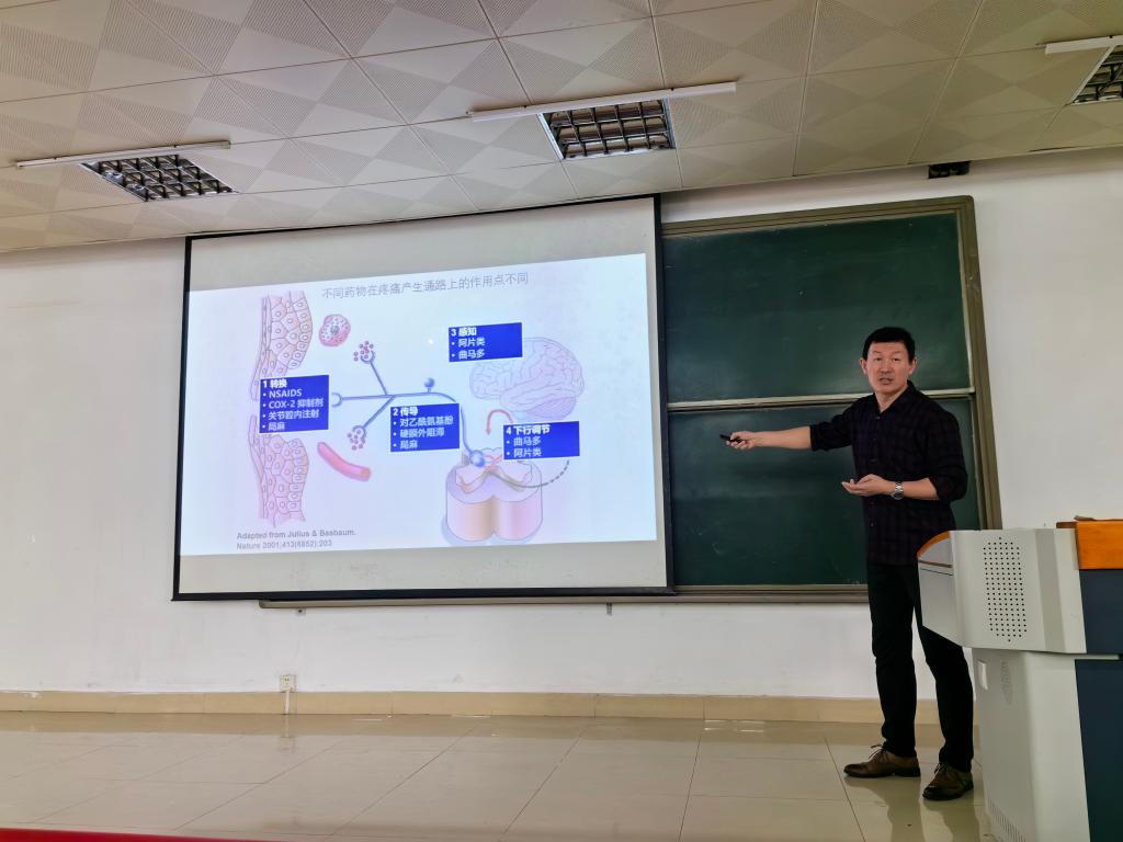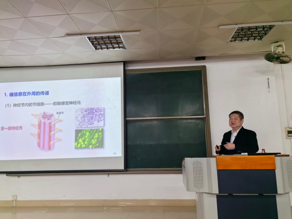课堂上,李云庆教授结合自己多年的研究成果,向同学们描述了身体的“好痛”和“坏痛”的区别和产生机制;他讲课既引经据典又严谨务实,给在场聆听的师生留下了深刻印象。而信文君教授的授课方式则轻松诙谐、饱含激情,在拉家常式的聊天中,把专业知识和人生哲理传递了出来。